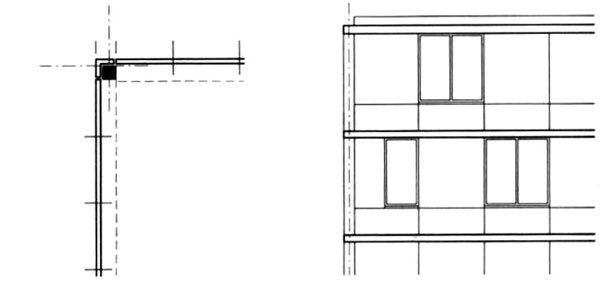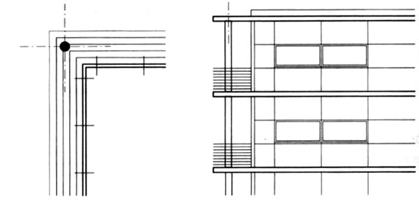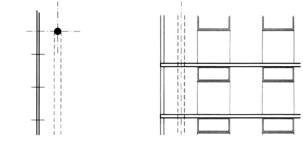 | Obr. 3 Podpery v rovine fasády [1] | Obr. 4 Podpery umiestnené mimo pôdorysu budovy, vyložené stropy [1] |