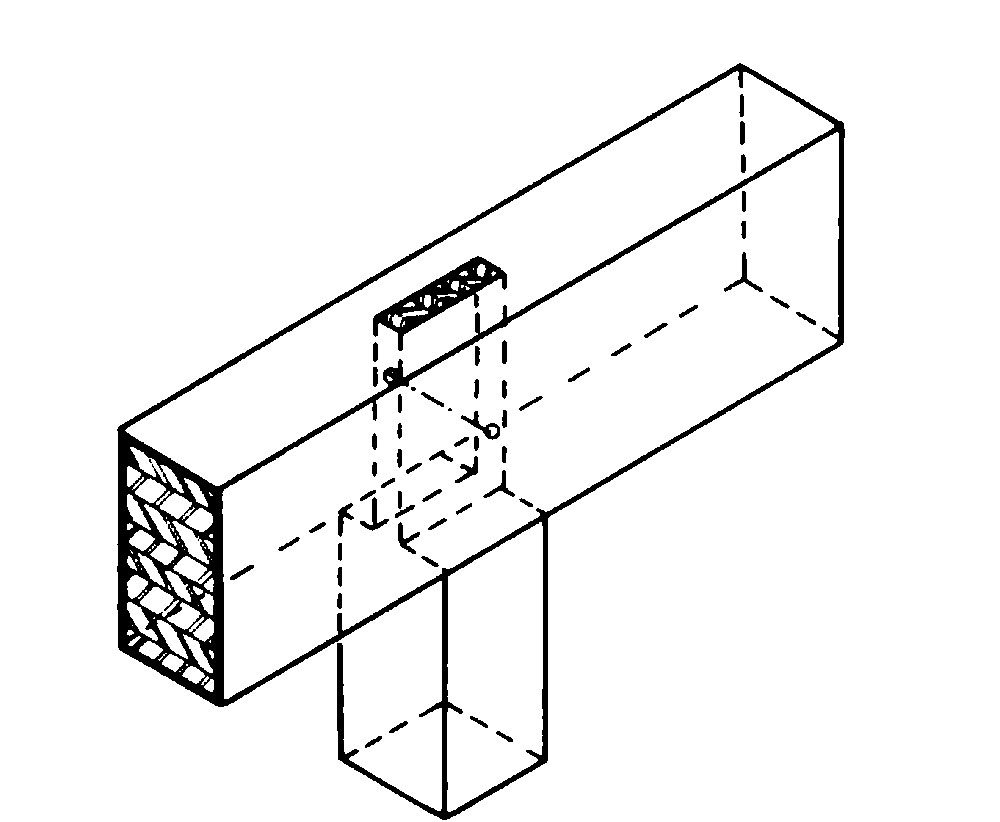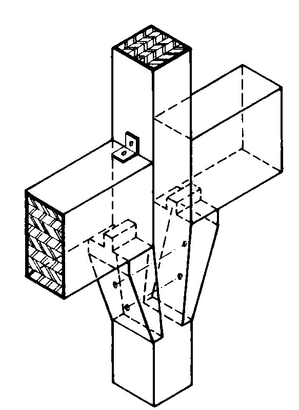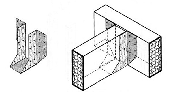 | Obr. 5 Spoj s podperou – úplný priebežný pravouhlý čap [1] | Obr. 6 Rohový spoj pri podpere – zapustená a pribitá príložka [1] |