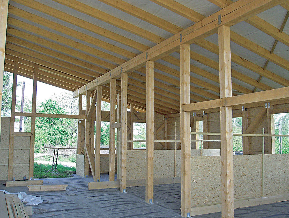 Obr. 14 Pohľad na vnútorné jednodielne stĺpy a prievlaky nosného systému realizovaného rodinného domu v obci Cíver, časť Jarná, (foto: R. Nôta)