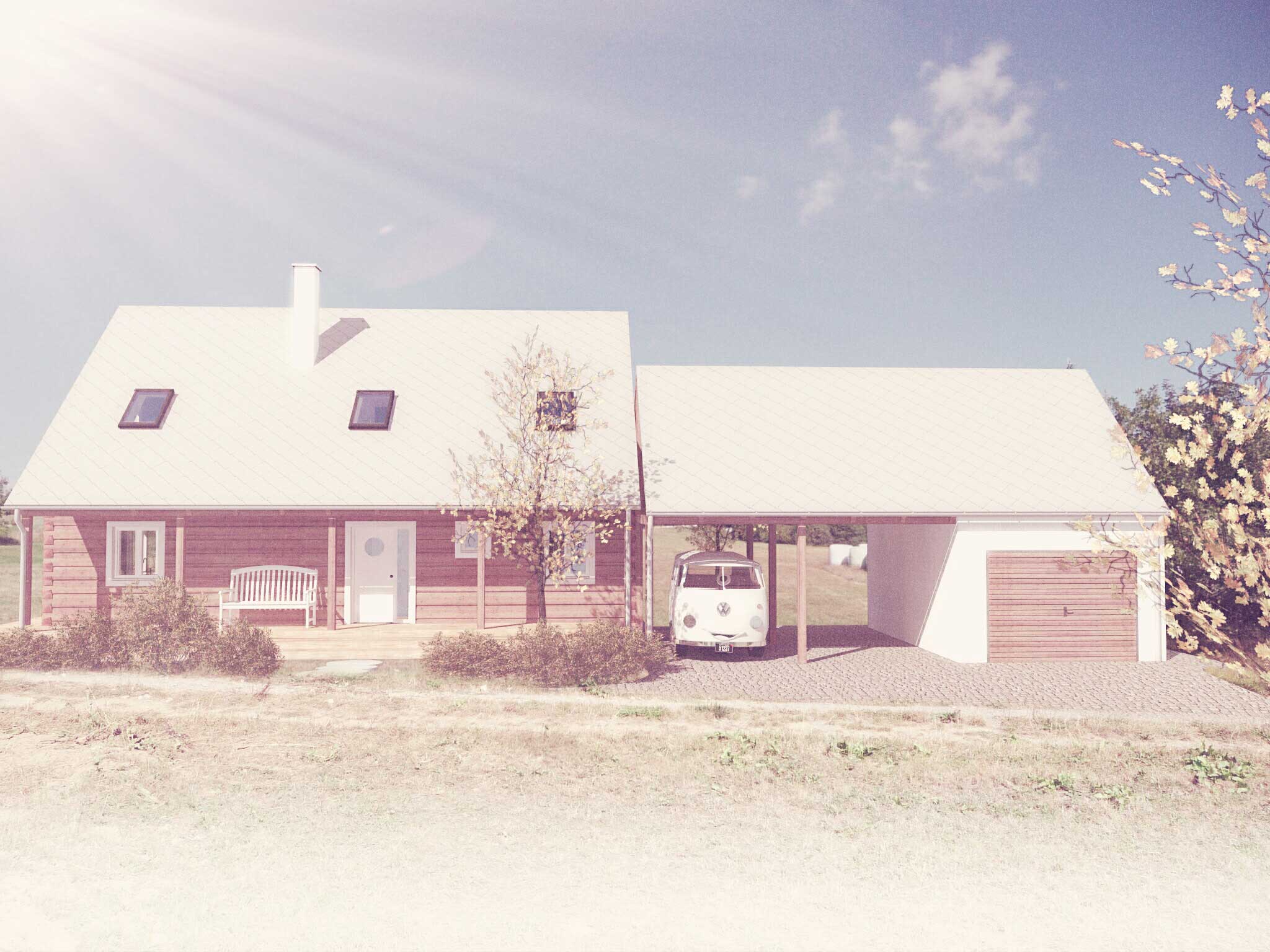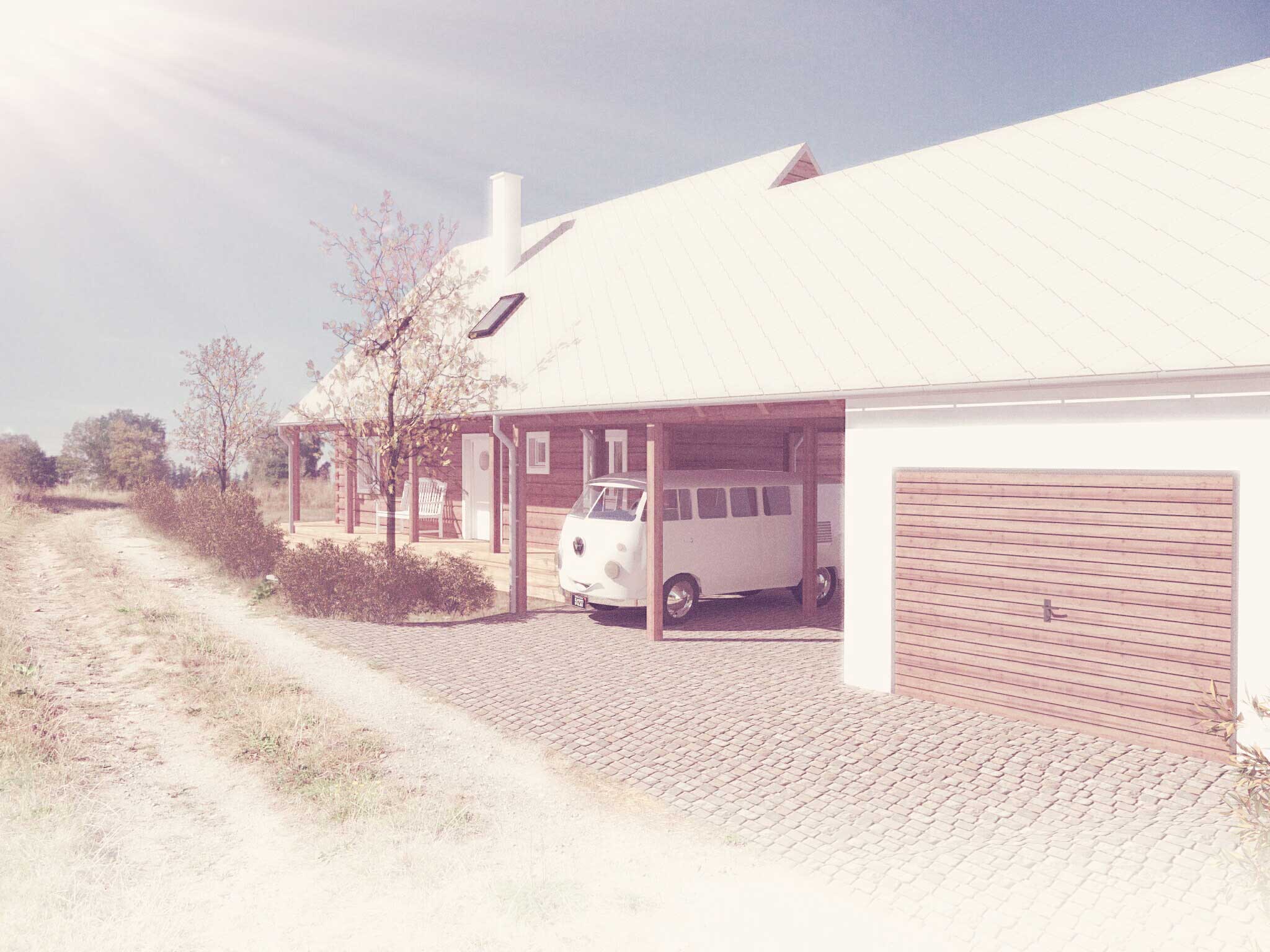 Veľmi zaujímavý i praktický je efekt presahu sedlovej strechy po oboch stranách domu, čím je vytvorený prekrytý priestor medzi interiérom a exteriérom využiteľný ako terasa či na odkladanie, ako priedomie či zápražie. V časti pri spoločenskom priestore prerastá do nekrytej vonkajšej terasy. Rovnako sa pod zastrešením nachádza aj vchod do samotného domu. Na pravej strane bude stáť kryté parkovanie pre dve autá a sklad záhradnej techniky.