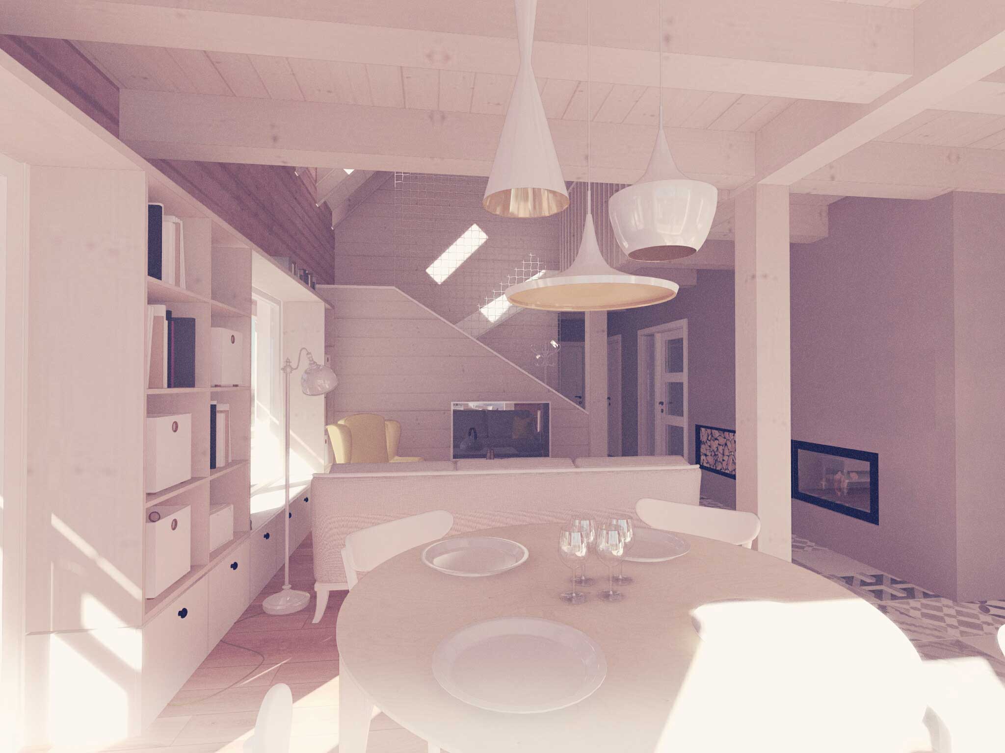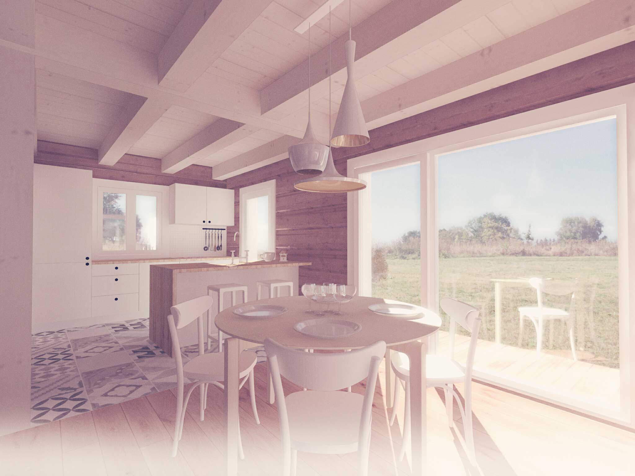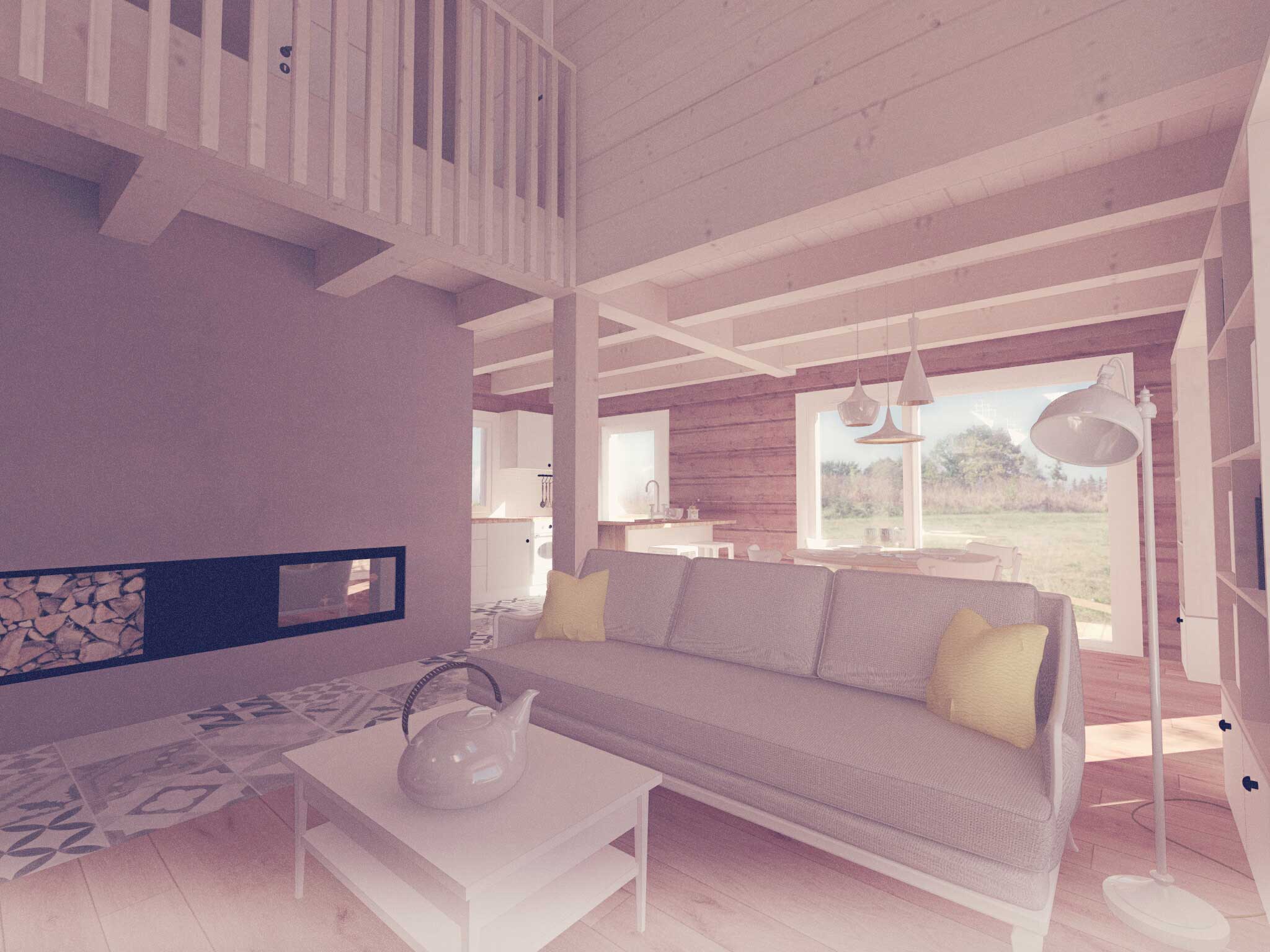 I keď dom pôsobí ako chata, je určený na celoročné bývanie. Na prízemí sa nachádza hlavná obytná miestnosť rozčlenená na obývaciu, jedálenskú a kuchynskú časť so špajzou, taktiež technická miestnosť. Obývacia (spoločenská) časť domu je dominantou interiéru. Tento priestor bude otvorený až po strechu. Efektne sa tu vyníma veľké okno s výhľadom na nerušenú prírodu. Pôsobivou súčasťou priestoru budú kozubové kachle.