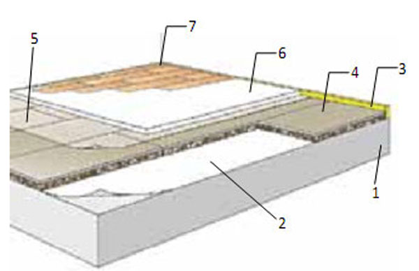 | Obr. 4 Zvuková izolácia priečky 1 – sadrokartón, 2 – drevocementová doska 25 mm, 3 – murivo, 4 – drevocementová doska 35 mm, 5 – sadrokartón, 6 – príchytky |