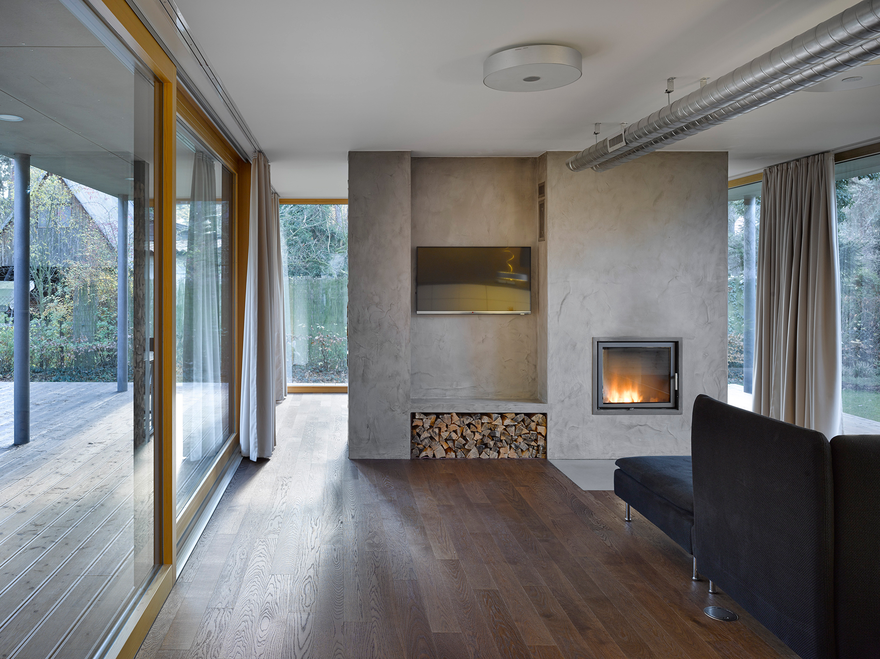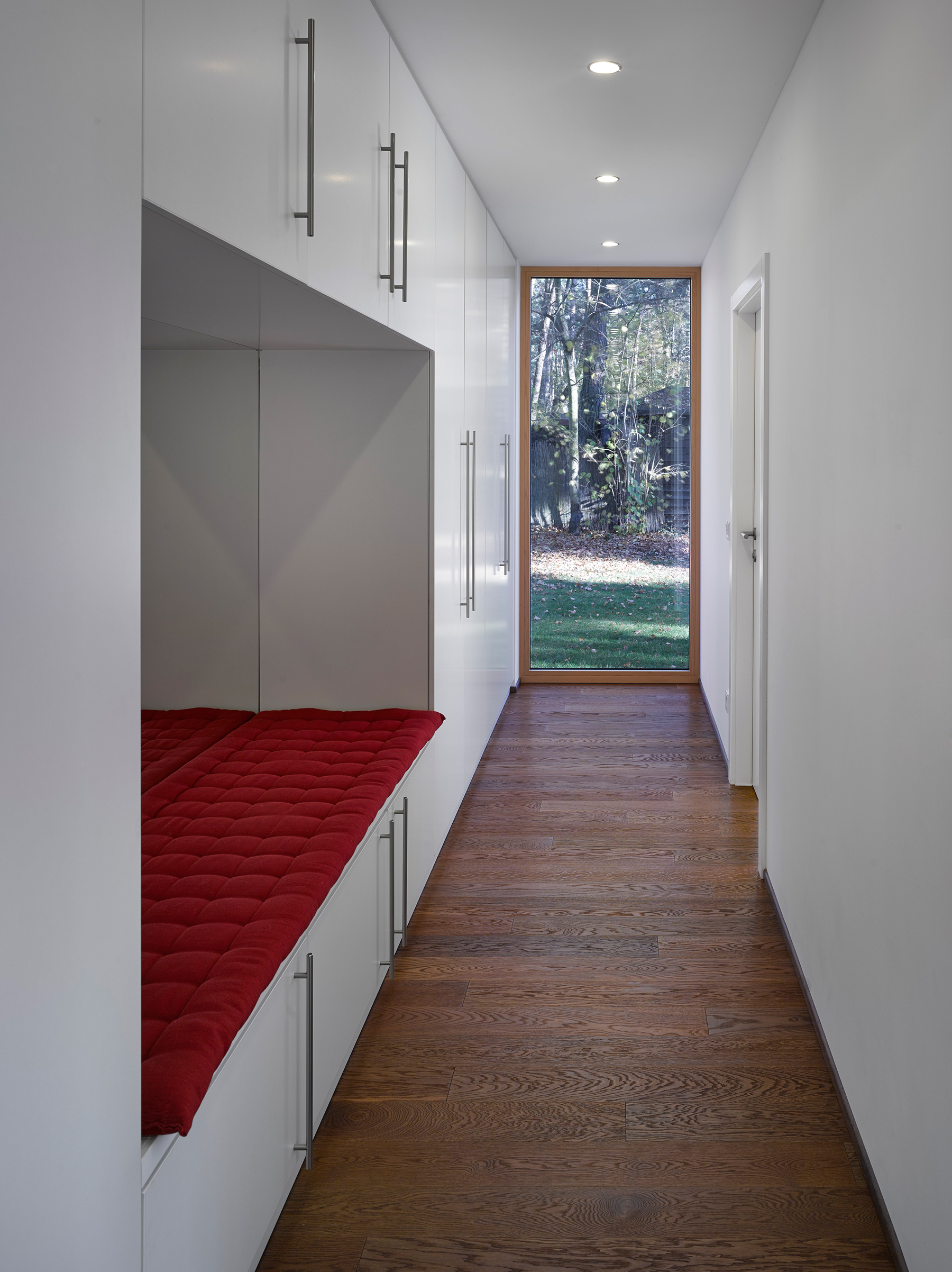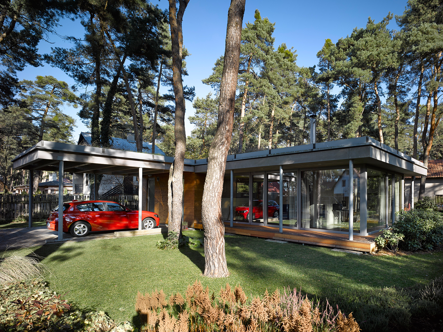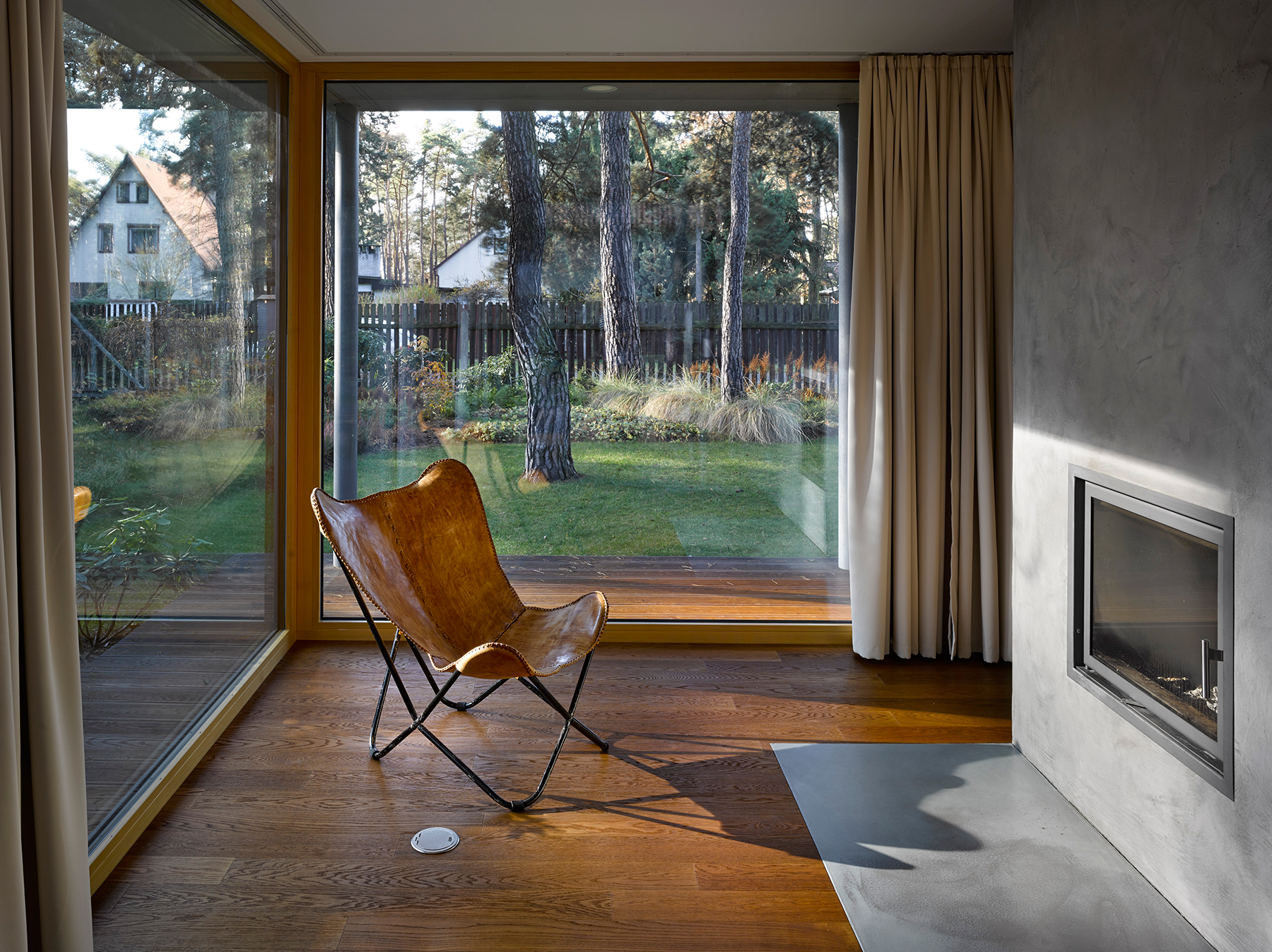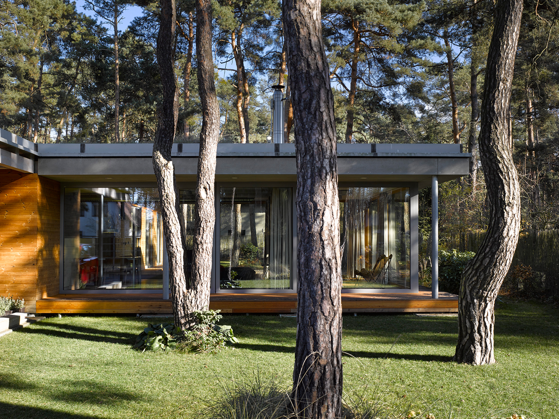 Krídlo domu so spoločenským priestorom architekti odeli do skla, takže z každej strany vidíte stromy a prírodu. Zaujímavé riešenie vytvára efekt, akoby ste sedeli priamo uprostred lesa. Spálňa, detské izby a kúpeľňa sú prístupné z chodby v druhom krídle domu. Táto časť nie je zasklená a poskytuje dostatok súkromia.