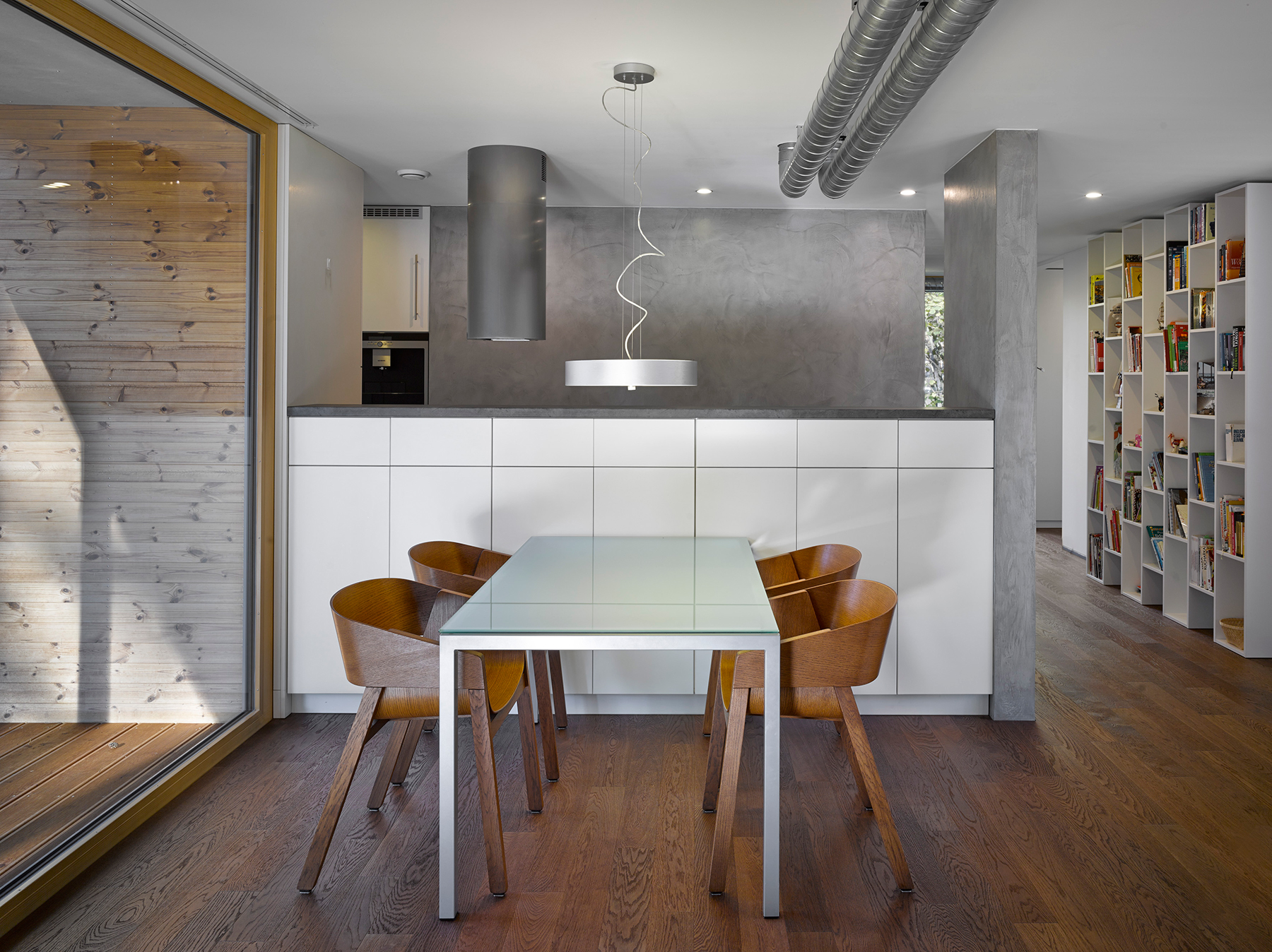 Vonkajšie steny sú obložené drevenými fošňami, fasáda i strecha sú prevetrávané. Podlahové vykurovanie domu dopĺňa systém riadeného vetrania s rekuperáciou tepla,“ vysvetľujú konštrukčné detaily autori príjemného domu.