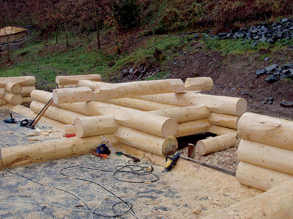 Spájanie zrubových trámov pri tzv. kanadskom zrube  Kanadský zrub