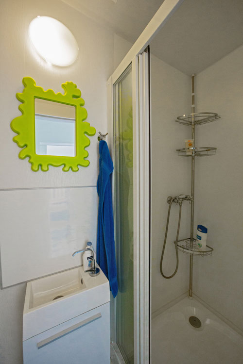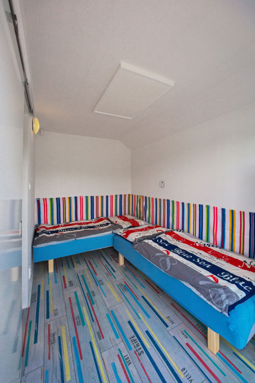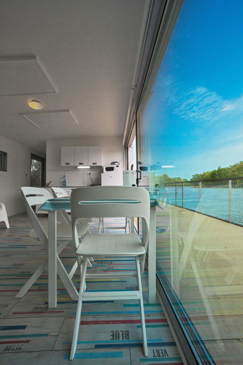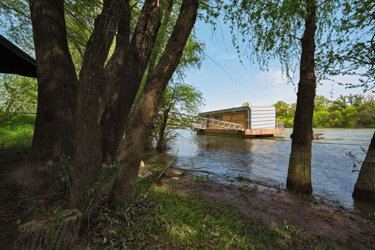 Dva železobetónové pontóny vyplnené expandovaným polystyrénom a spojené oceľovou konštrukciou držia nad vodou jednopodlažný rekreačný dom z dreva. Dvanásť metrov dlhá a vyše šesť metrov široká chata je riešená ako montovaná drevostavba s odvetrávanou fasádou. Na izoláciu stien bola použitá fúkaná celulóza a vonkajšie obloženie fasády tvorí tepelne upravená severská borovica, ktorá je v protišmykovej úprave využitá aj na terase plávajúcej chaty. Charakteristická je strecha z pozinkovaného plechu pokrývajúceho aj bočné steny chaty. S pontónmi je táto drevená nadstavba spojená podpornou oceľovou konštrukciou, ktorá je k pontónom prichytená zabetónovanými maticami.Plávajúca drevostavba je s brehom spojená vzperou a mostíkom, ktorým je vedený elektrický kábel z prípojky na brehu. Dom je uspôsobený na možné napojenie na vodovodnú sieť, pripojený však nie je. Pitná voda je donášaná, úžitková potom čerpaná priamo z rieky a spracovávaná vo filtračnej sústave. Odpad je riešený domácou čističkou odpadových vôd zabudovanou v jednom z pontónov. Vyčistená voda môže byť vďaka svojim parametrom vypúšťaná priamo do rieky. Kúrenie nie je vzhľadom na sezónne využívanie domu riešené, prípadne je možné využiť elektrické ohrievače a infražiariče. Riešenie vnútorného priestoru chaty je maximálne jednoduché. Dve spálne sú prepojené hlavným obývacím priestorom s kuchynským kútom, kde na prvý pohľad zaujme nápaditá farebná podlaha, ktorú podčiarkujú farebné doplnky a prevažne biele vybavenie izby. Zásadným prvkom projektu je kompletné zasklenie steny smerom k vode, realizované hliníkovými rámami s izolačnými dvojsklami. Nechýbajú ani kúpeľňa so sprchovým kútom a technická miestnosť na filtračnú sústavu. Plávajúca drevostavba je dielom lodných architektov zo spoločnosti MANDL – Living on water, ktorí majú vo svojom portfóliu aj jeden veľmi vydarený nízkoenergetický plávajúci rodinný dom.