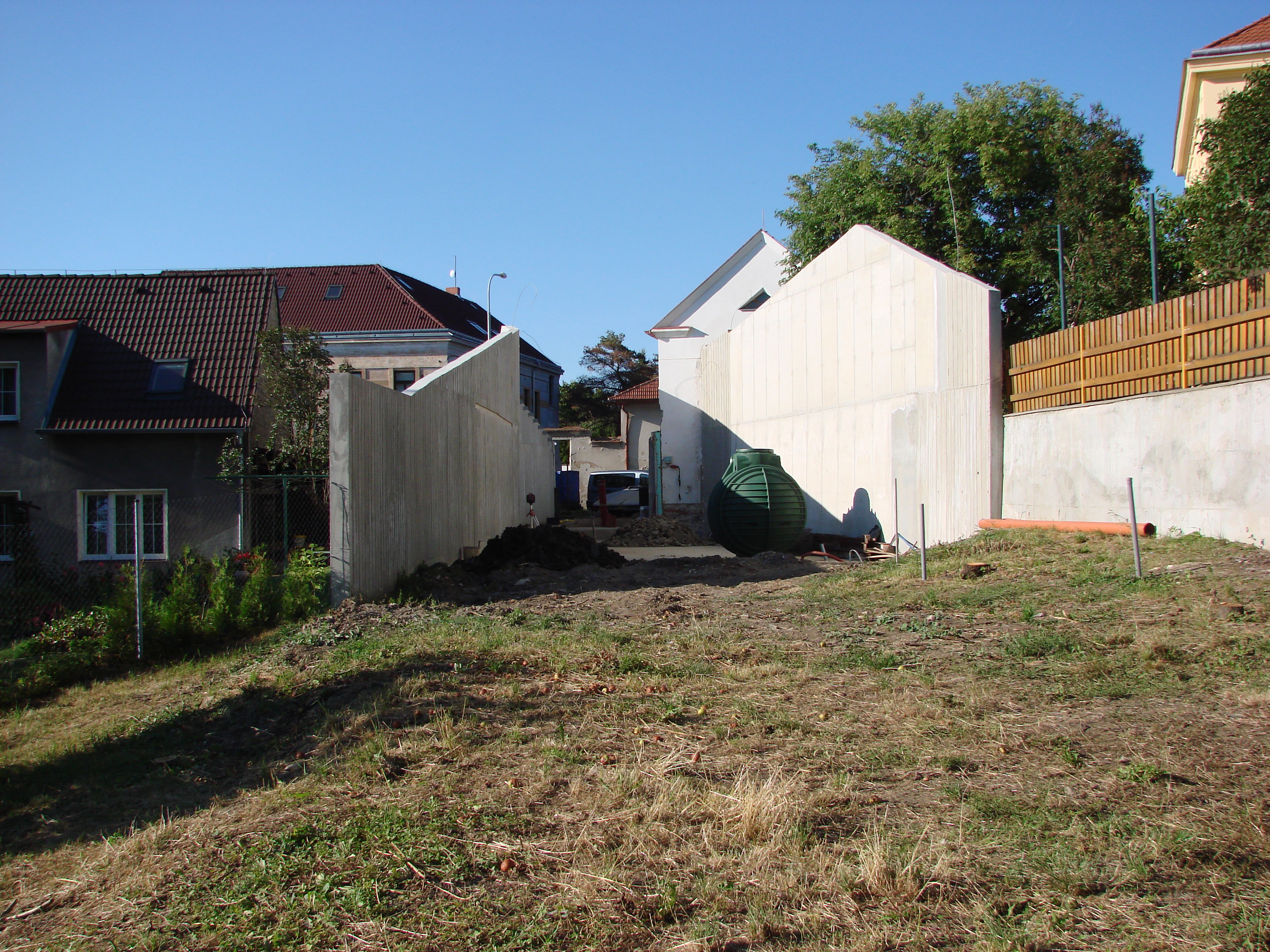 Pohľad zo záhrady na betónovú úžinu s pripravenou nádržou na dažďovú vodu