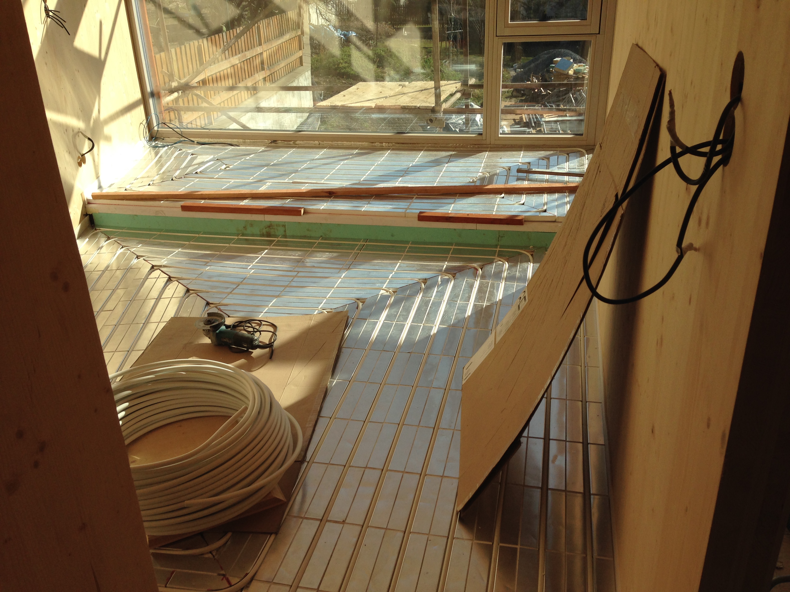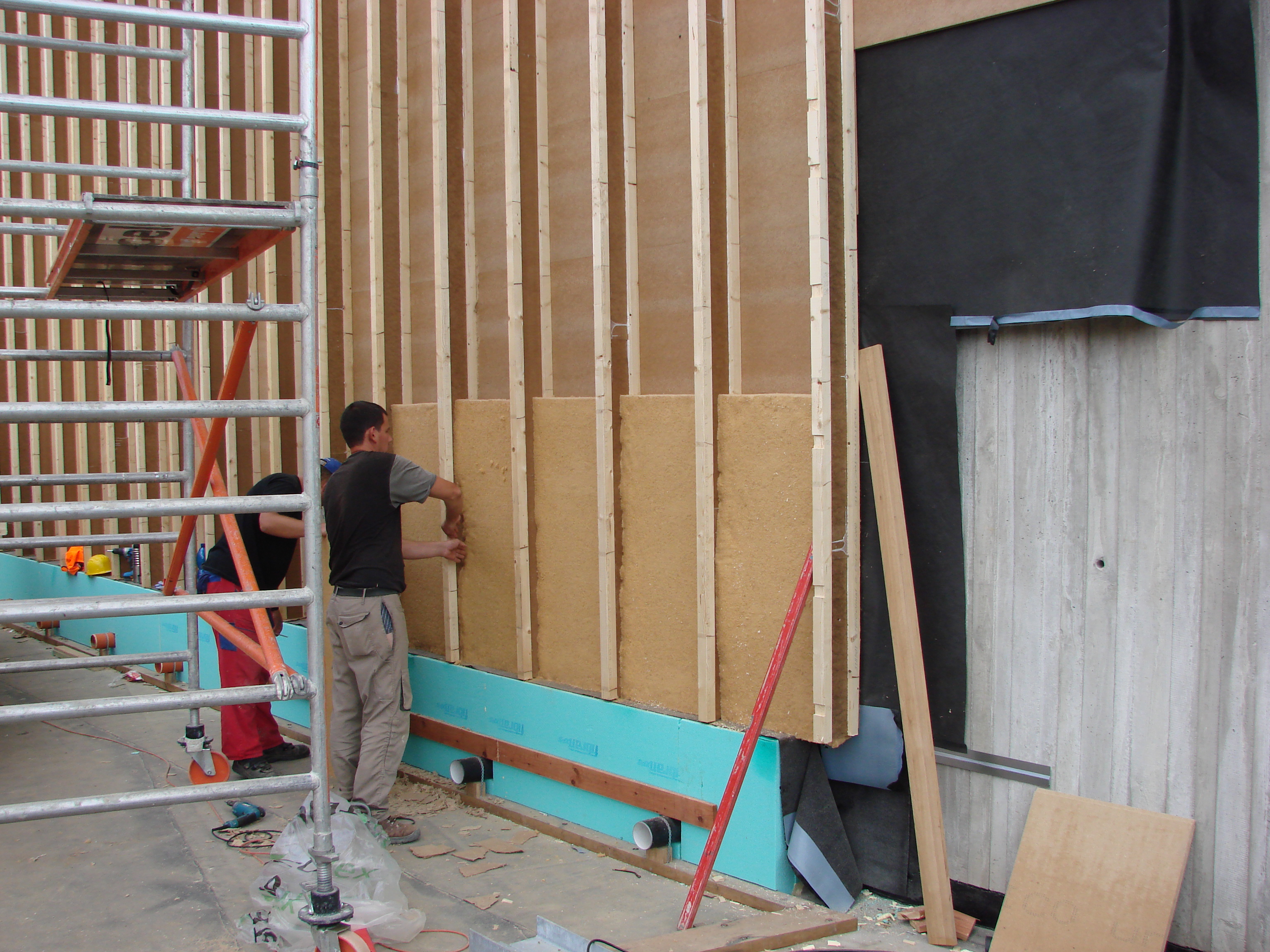 Stavba v betónovej úžine znamenala v niektorých miestach obrátený spôsob výstavby. Najprv bolo nutné realizovať zateplenie, následne k zatepleniu pridať stenu. V dolnej časti vetrania vidieť vzduchové medzery medzi izoláciou a betónovou stenou.