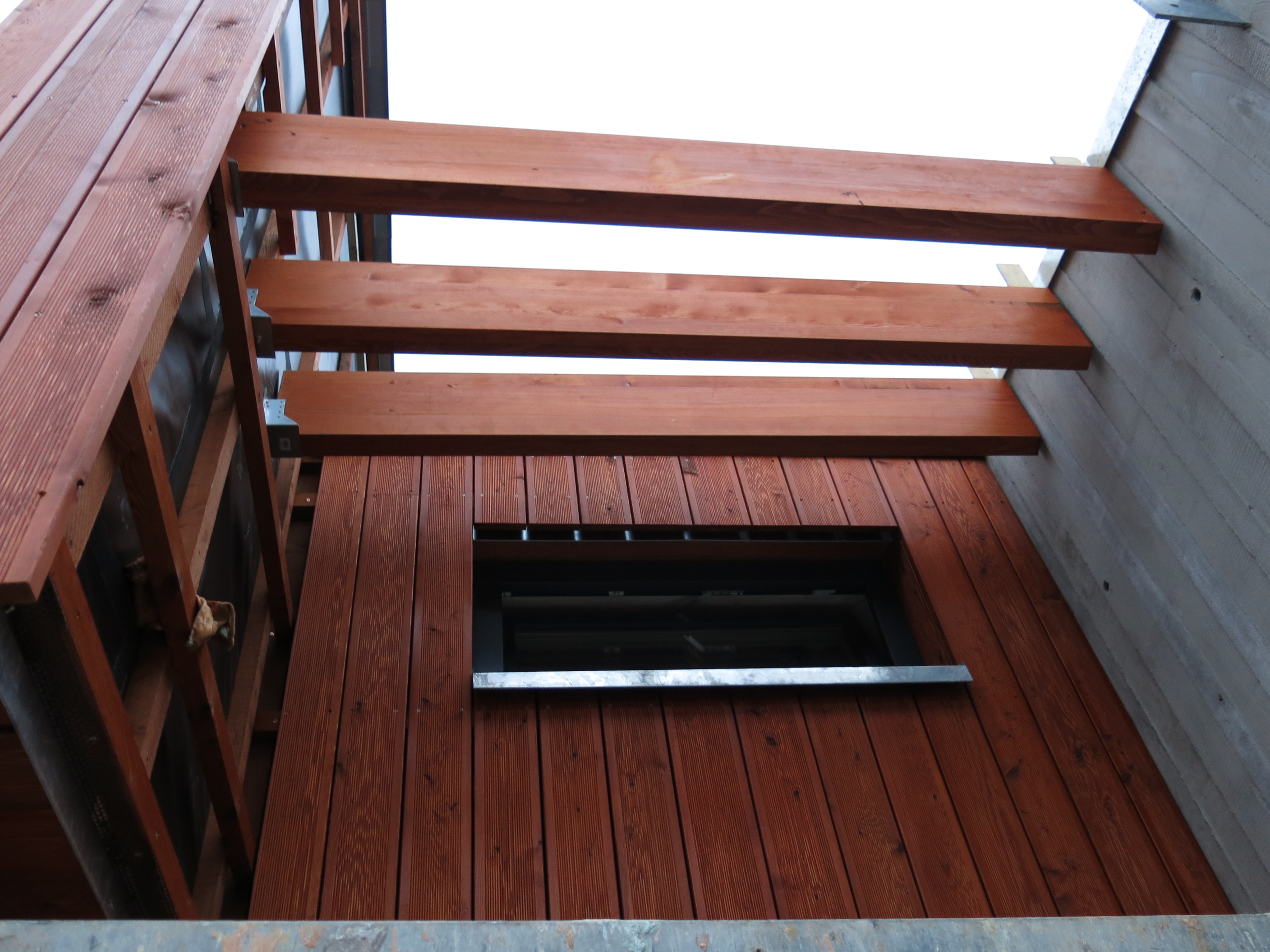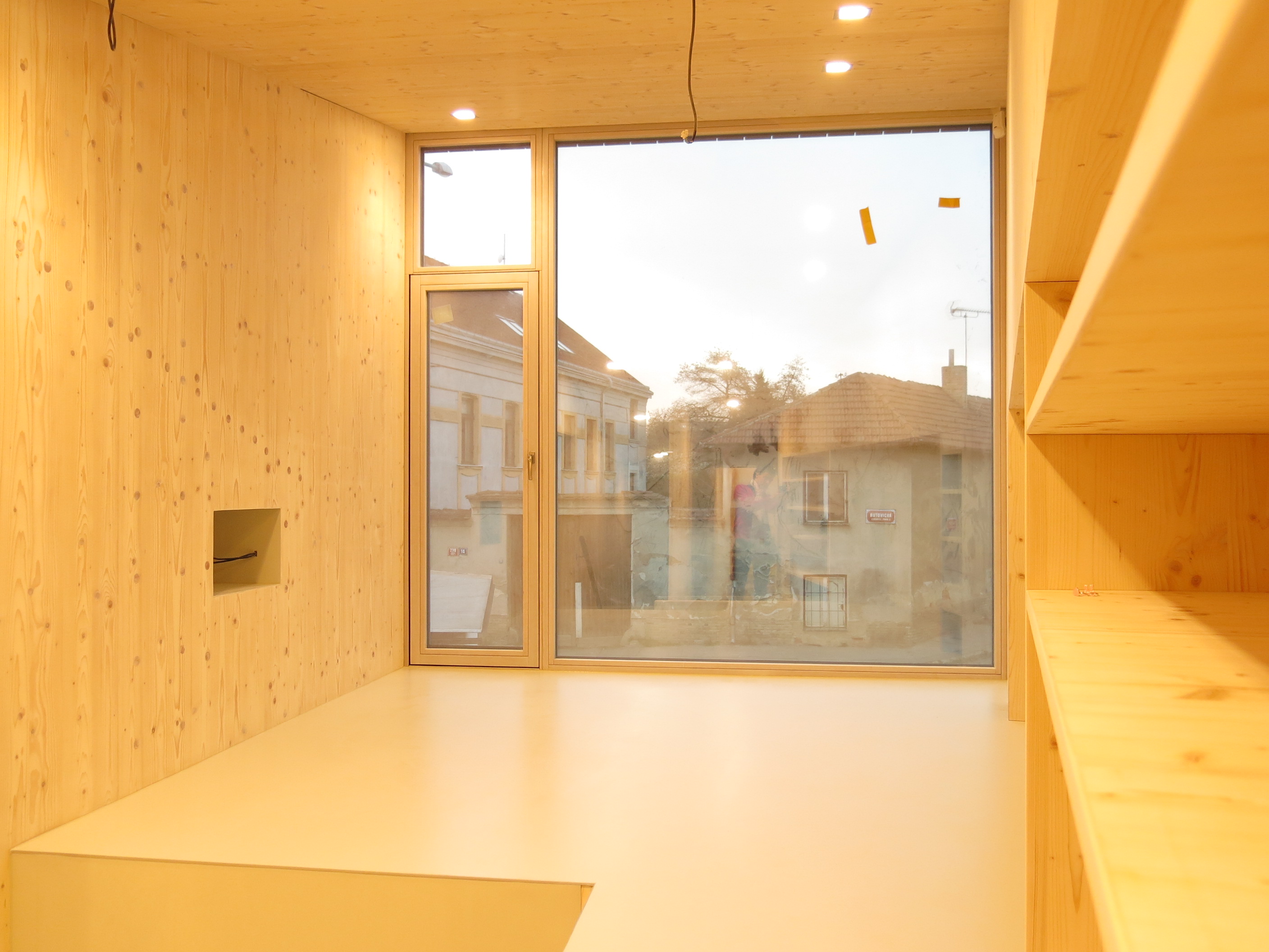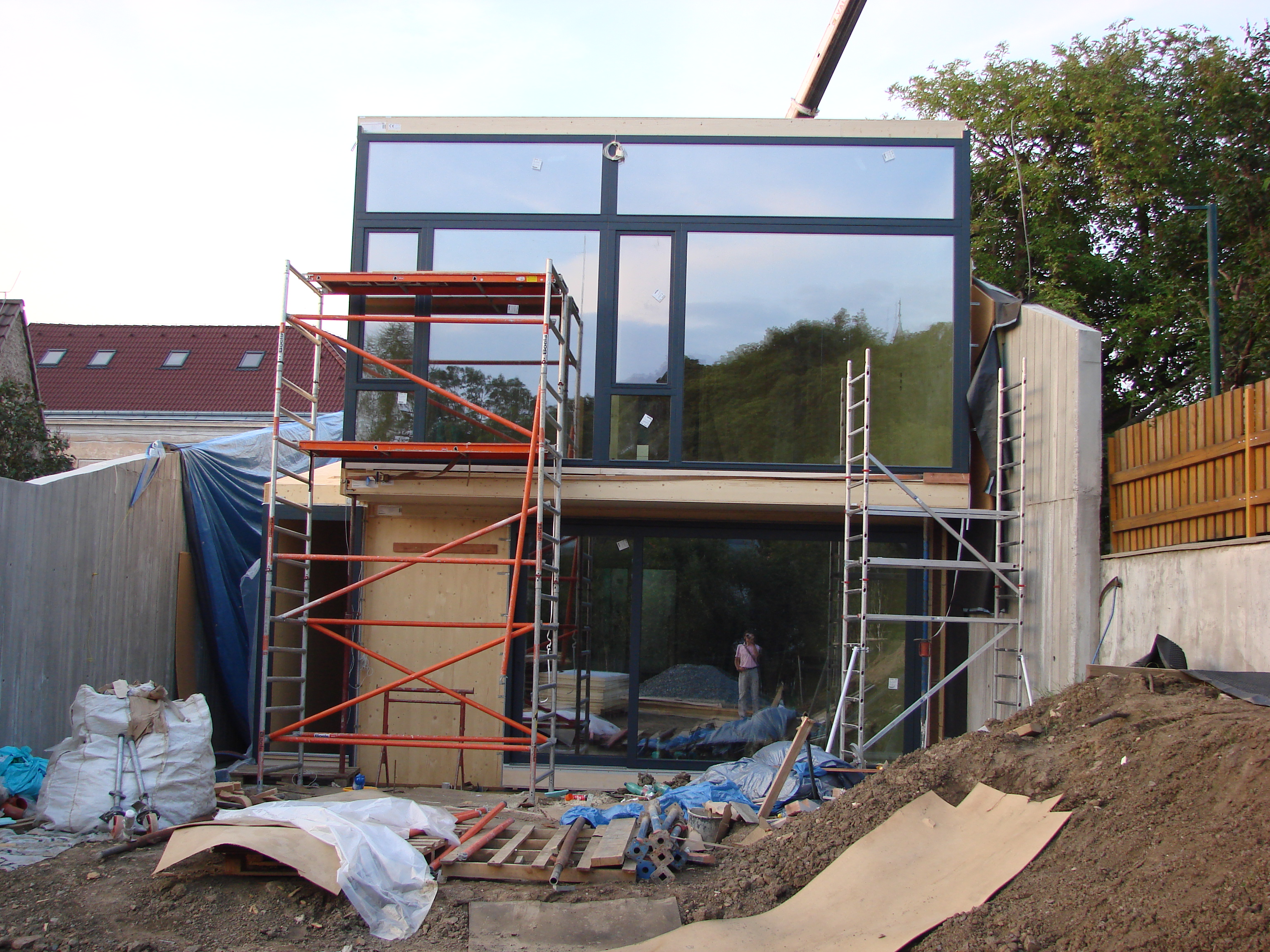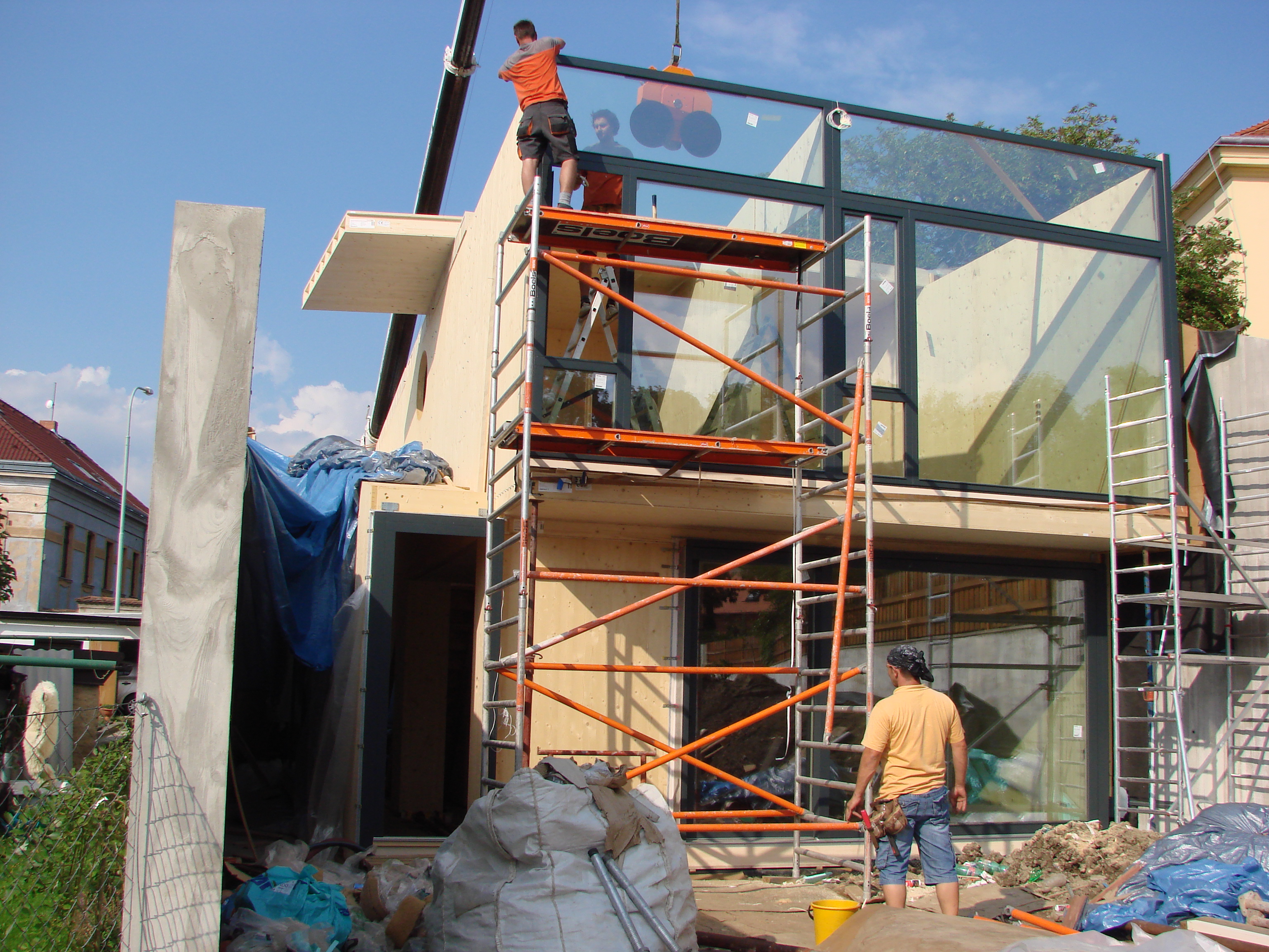 Pre stiesnenosť a neprístupnosť pozemku musela spolu s montážou drevenej konštrukcie prebiehať aj montáž okien. Okná sa teda nemohli zamerať, ale zadávali sa do výroby na základe výrobnej dokumentácie drevostavby.