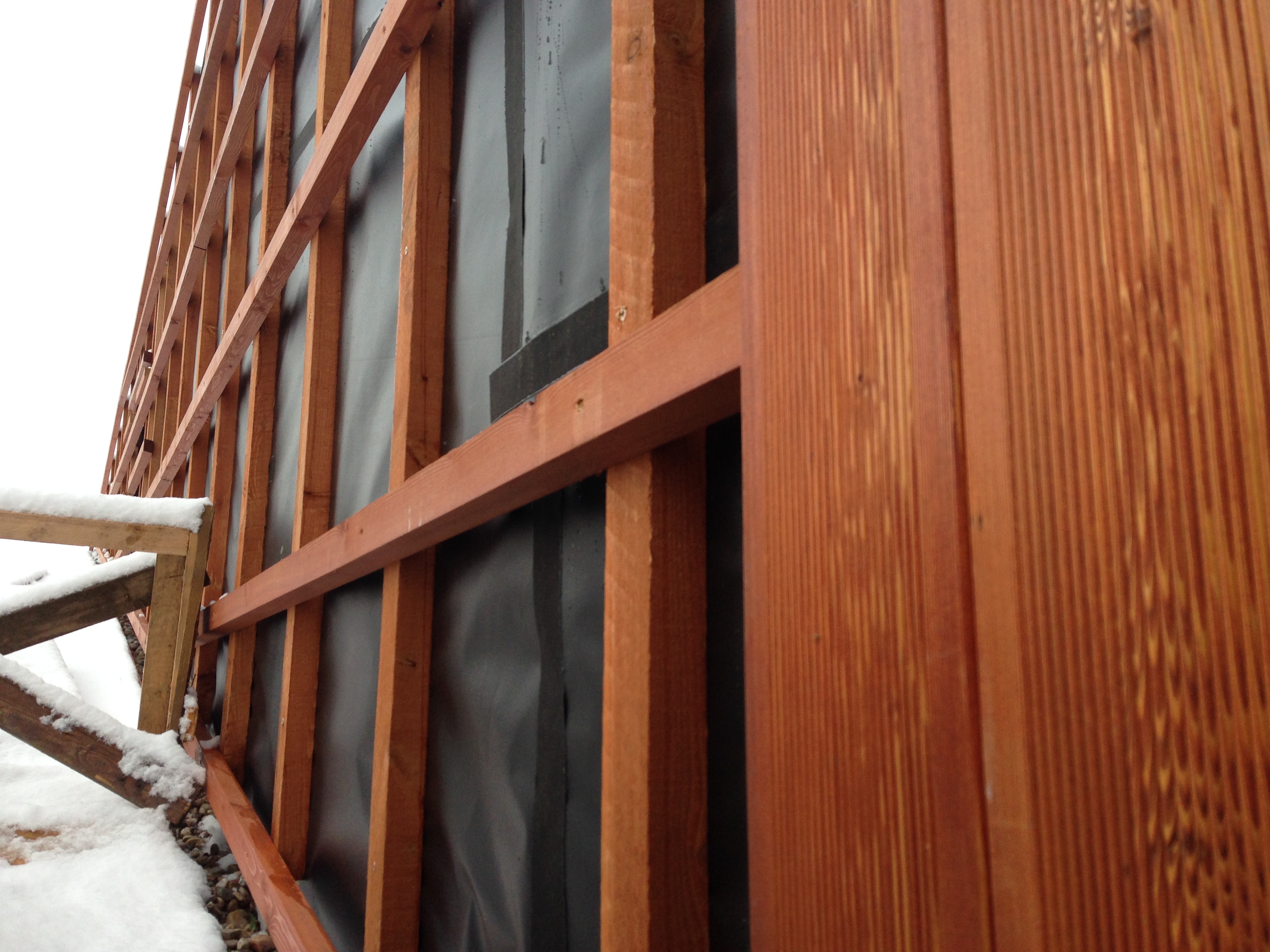 Smrekovcová fasáda – vodorovné laty sú skosené z dôvodu odtekania vody z roštu.