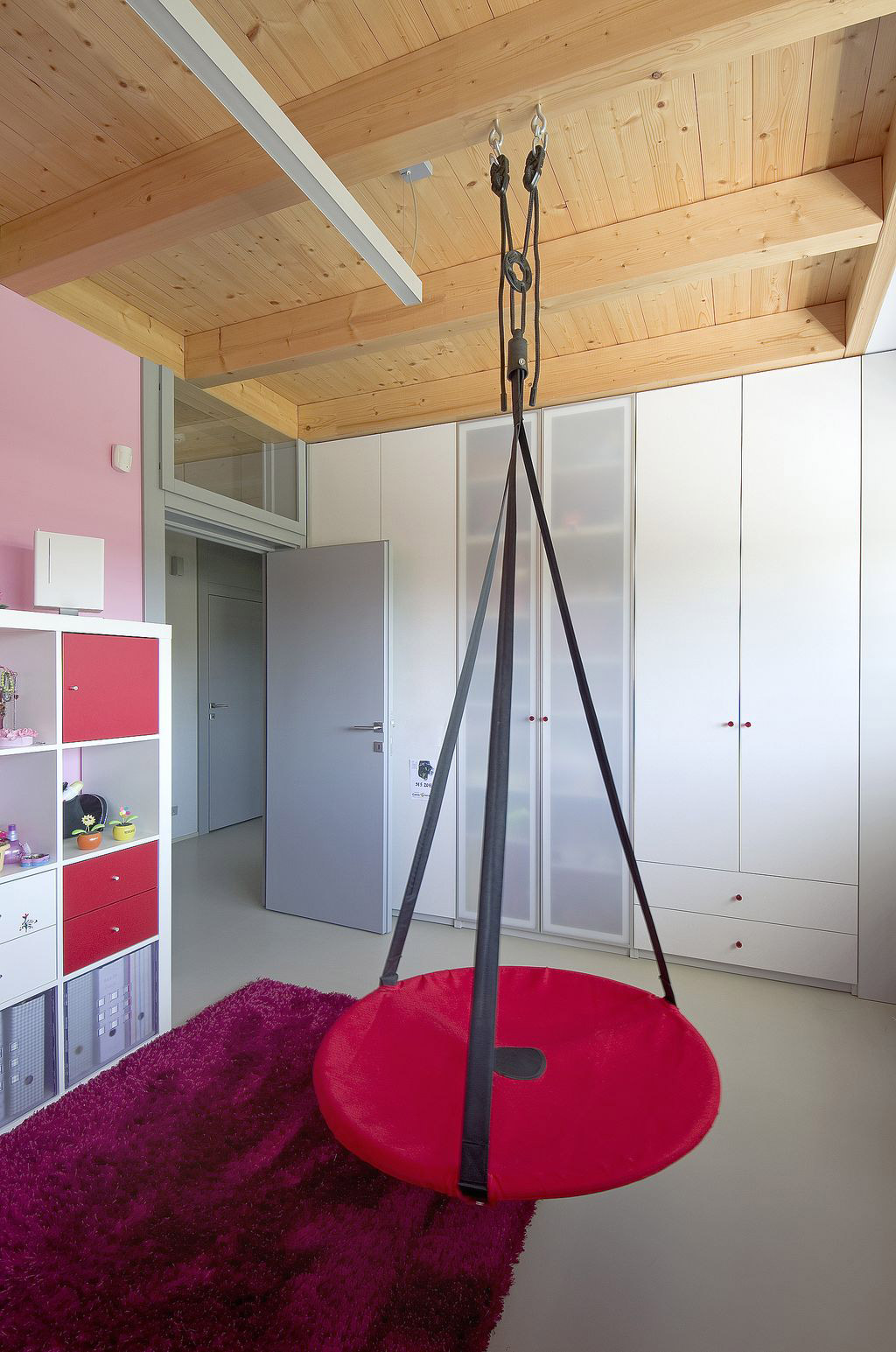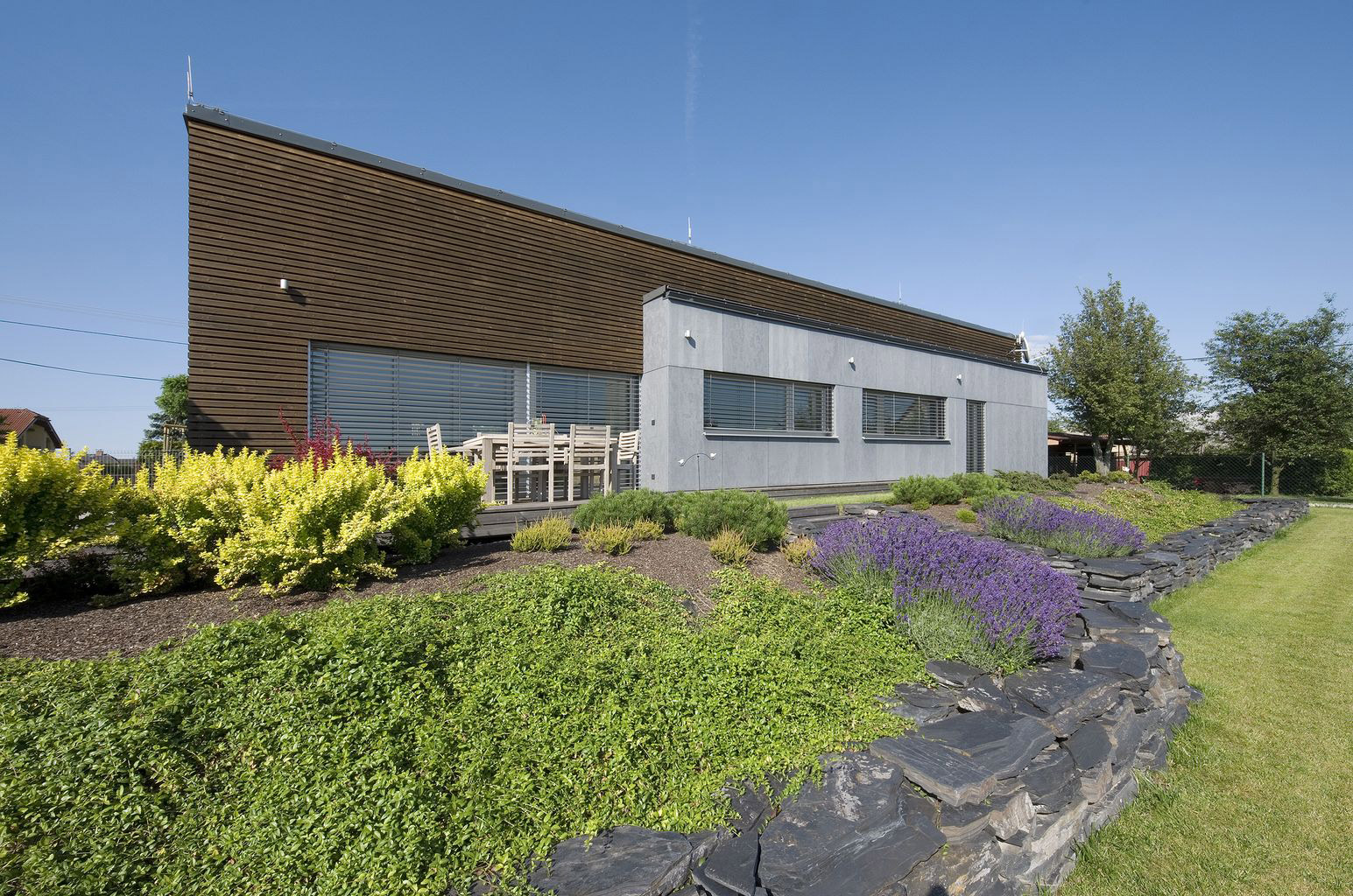 Opticky pôsobí ako z dvoch odlišných celkov – záleží na tom, z ktorej strany sa naň pozeráte. Najpríjemnejšia časť je i v tomto prípade nasmerovaná do záhrady, kde sa interiér pozvoľna mení na exteriér prostredníctvom terasy a schodov do záhrady zdobených kamenným múrikom. Základným pravidlom stavby tohto domu bola jednoduchá geometria, moderný architektonický koncept, ale predovšetkým ekologickosť a ekonomickosť.