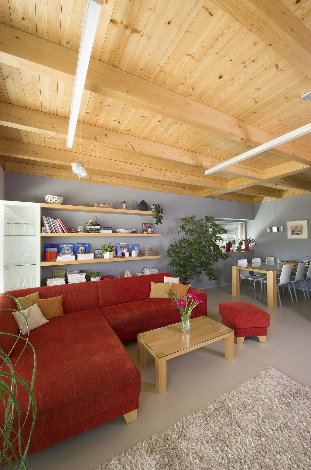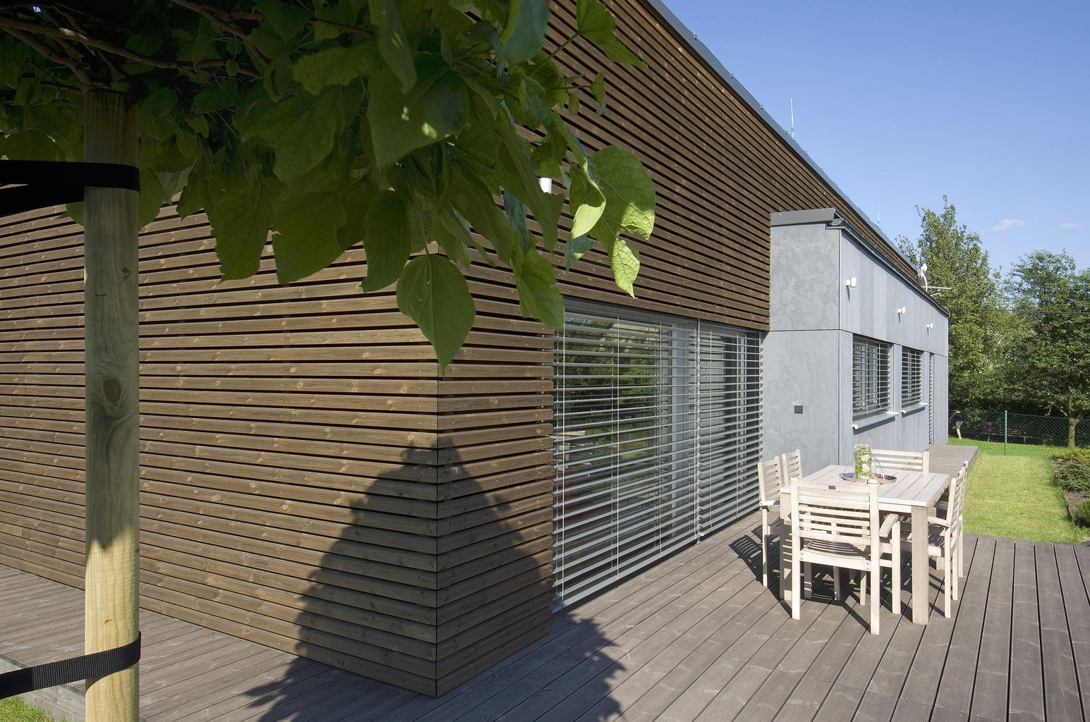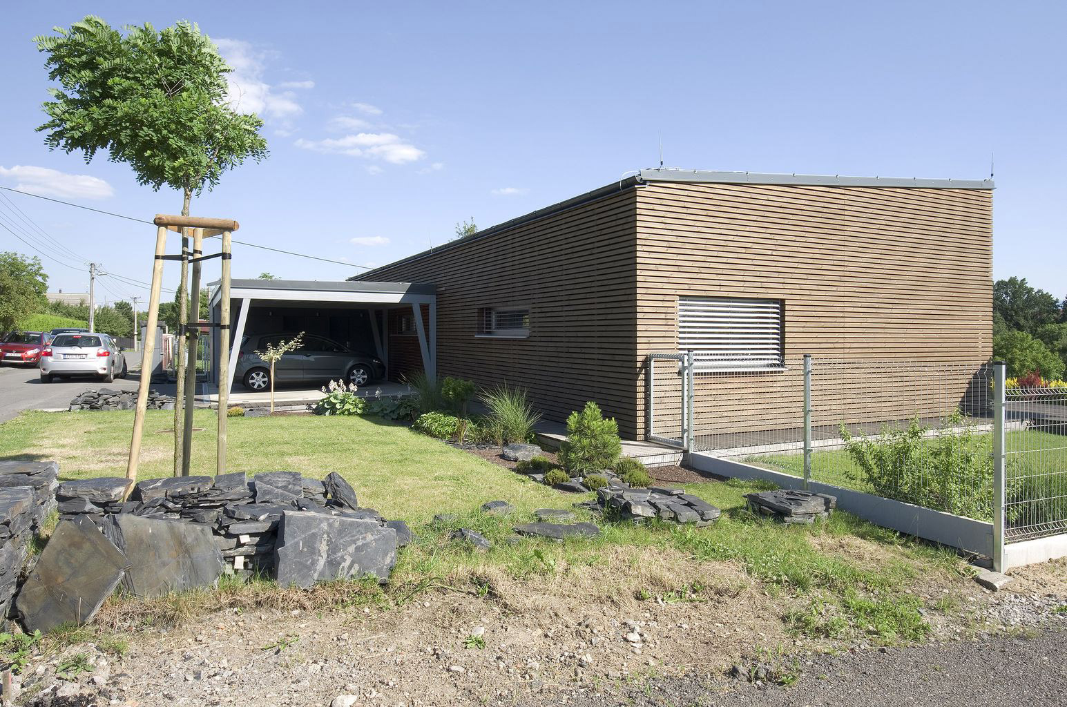 Obvodové steny a strecha jednopodlažného domu sú difúzne otvorené (difúzny spád), fasáda a strecha sú prevetrávané. Efektný obklad domu je vytvorený z vodorovných borovicových lamiel thermowood (napustených olejom) v kombinácii s tmavosivým cembonitom.