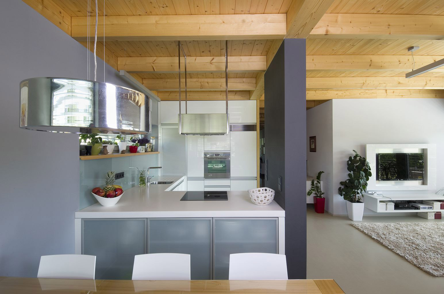 Stredovou osou je oddelená aj spoločenská časť domu – v severnej časti otočenej smerom k ulici je umiestnená kuchyňa s jedálenským kútom, v južnej časti obývacia miestnosť prepojená posuvnými dverami priamo s terasou.