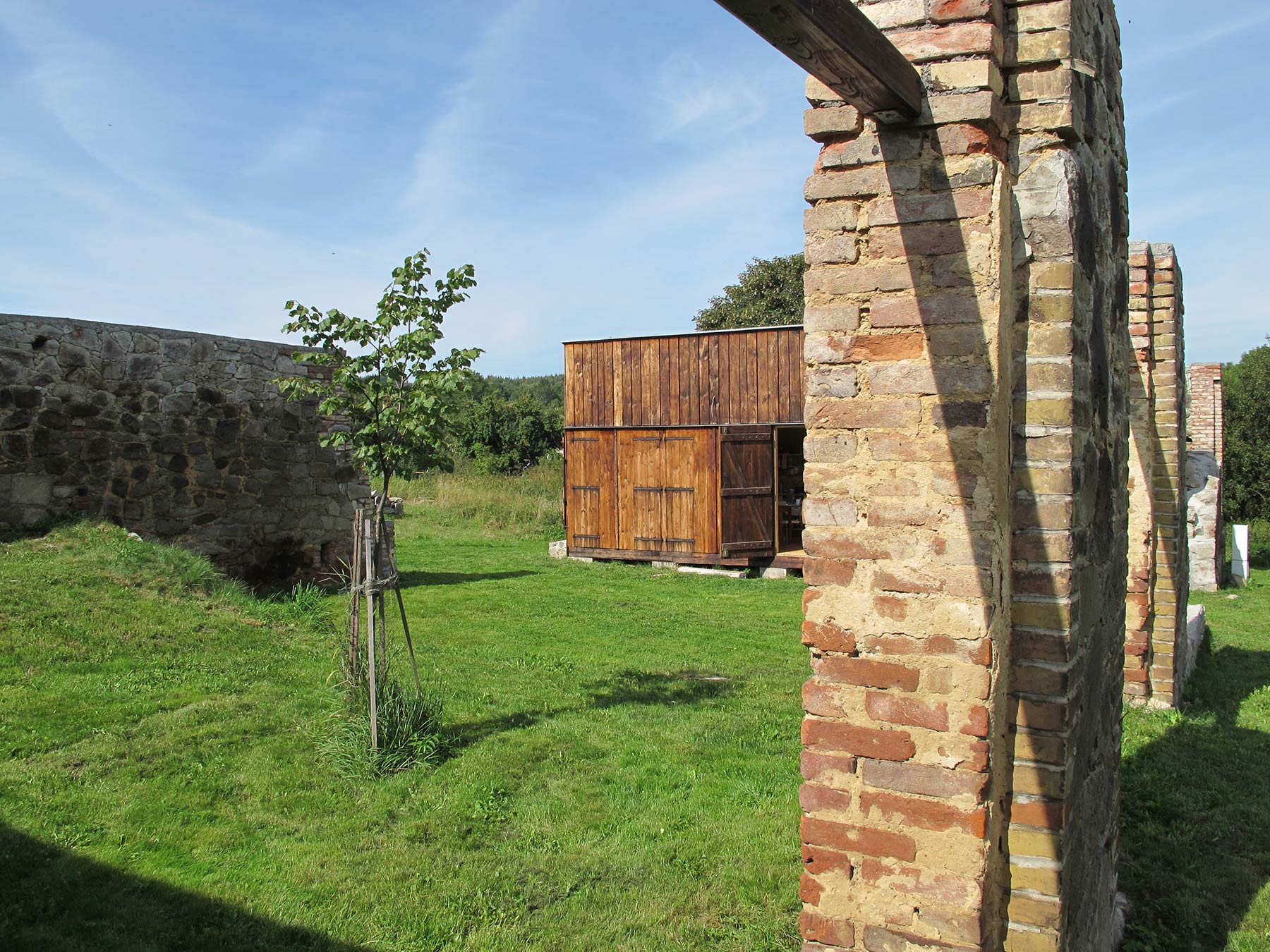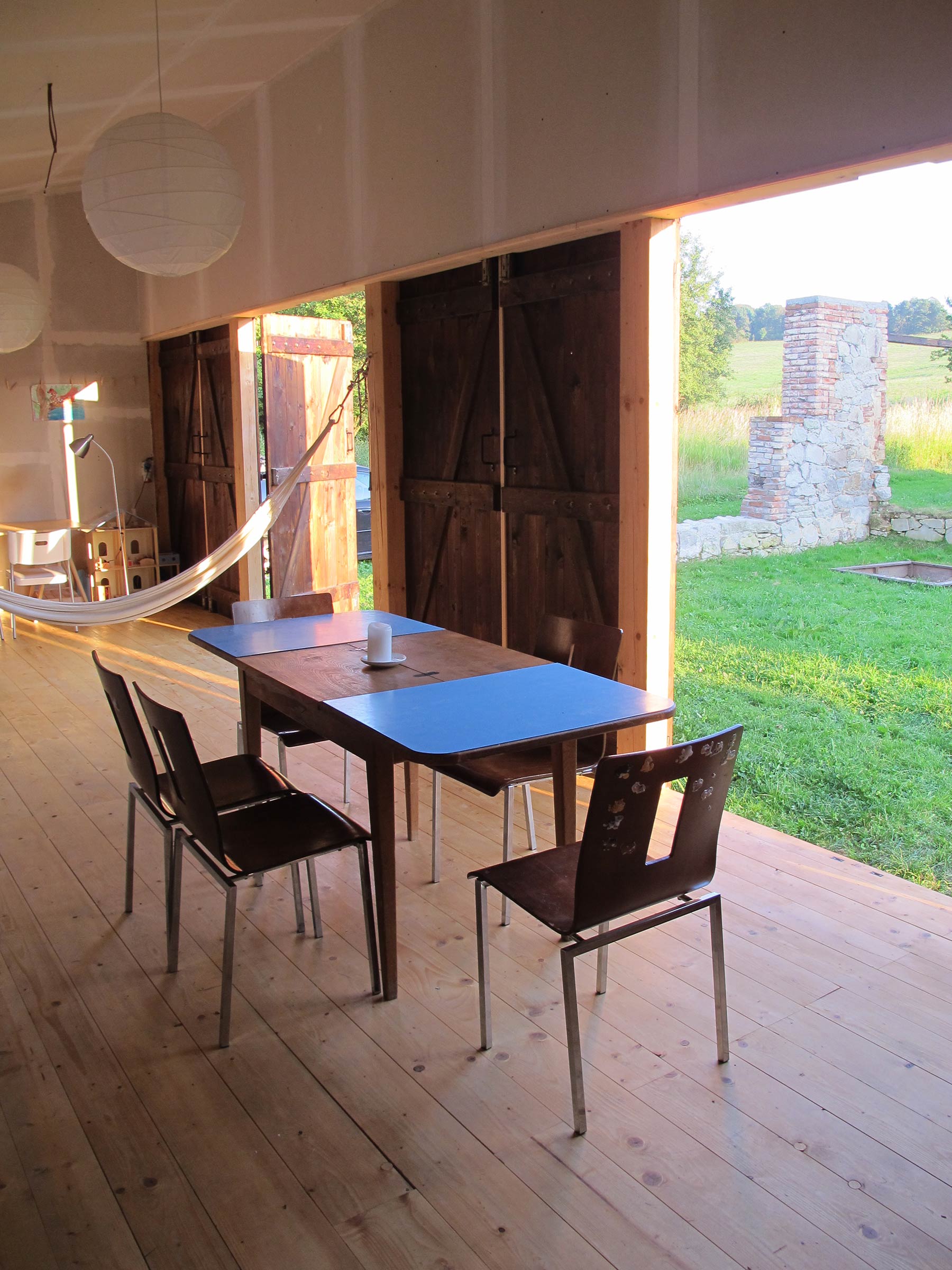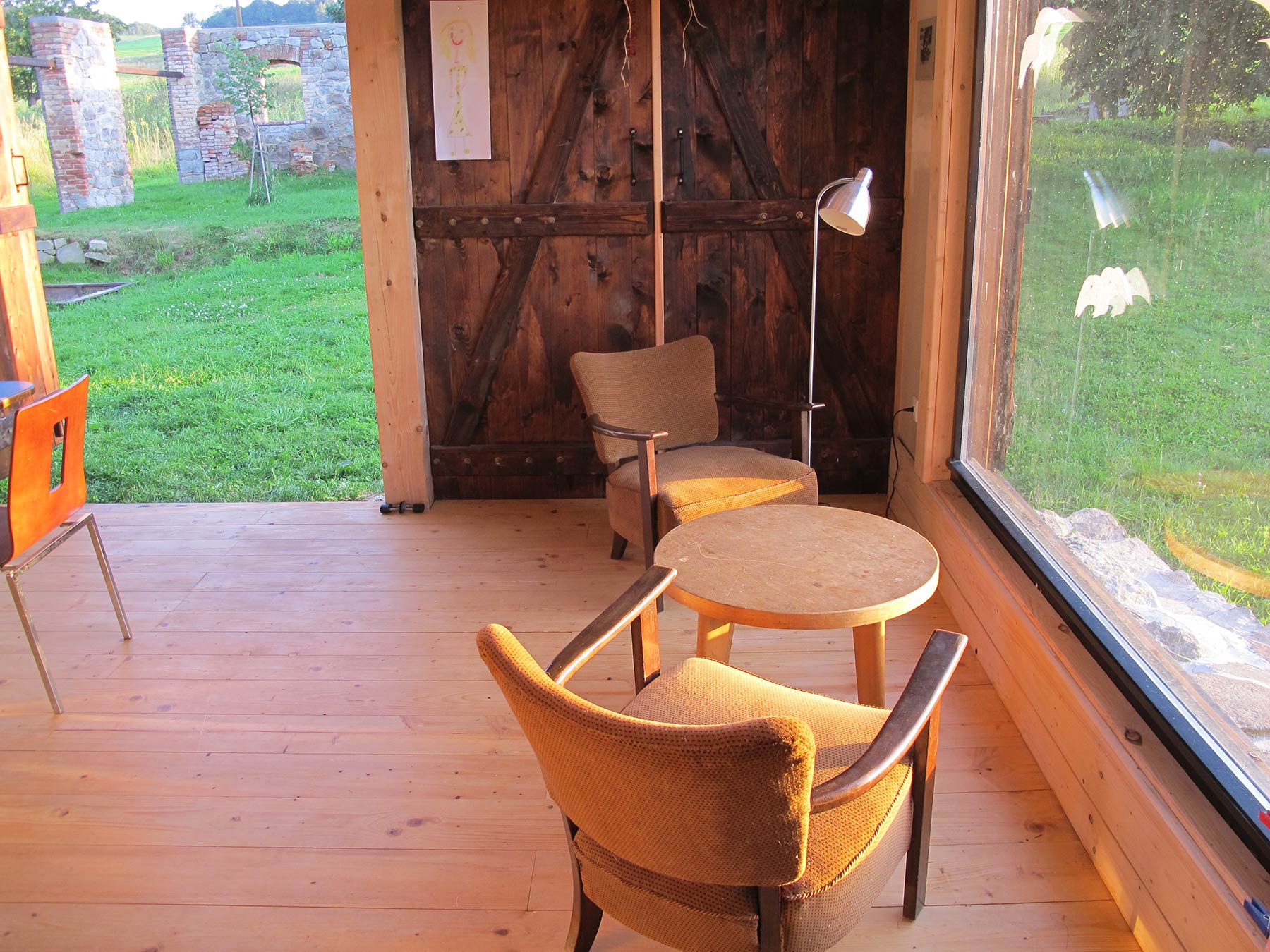 … otvorí sa súčasne aj celý objekt do prírody, do priestoru vymedzeného zostávajúcimi zvyškami obvodových sien stodoly. V tomto priestore je tak jasne definovaná súkromná záhrada objektu, vymedzená voči okolitej divokej vegetácii. Do záhady sa môže vchádzať všetkými dverami, aj keď to nie je ich hlavný účel. Ten tkvie, ako už bolo povedané, v možnosti maximálne otvoriť interiér. Vo dverách sa dá pohodlne sedieť a sledovať, čo sa deje v záhrade.