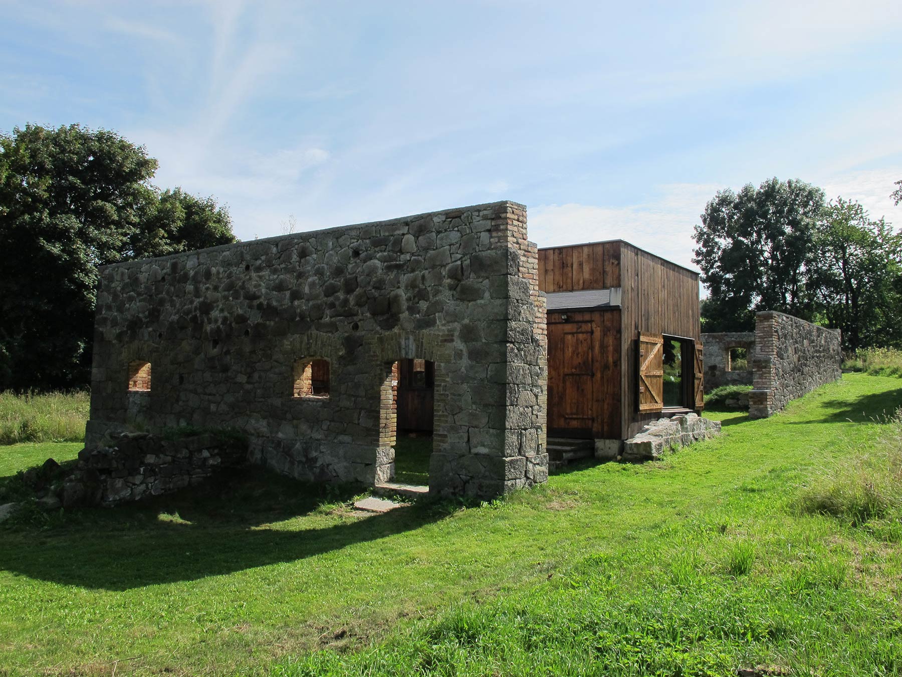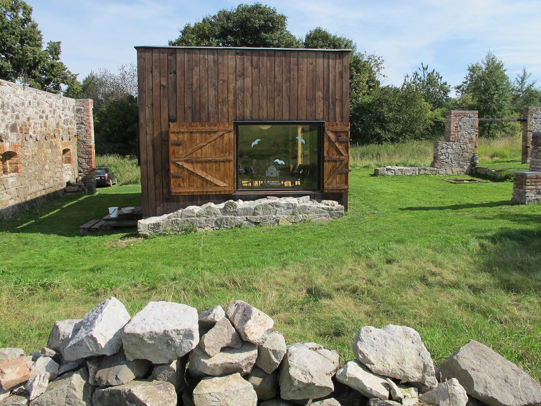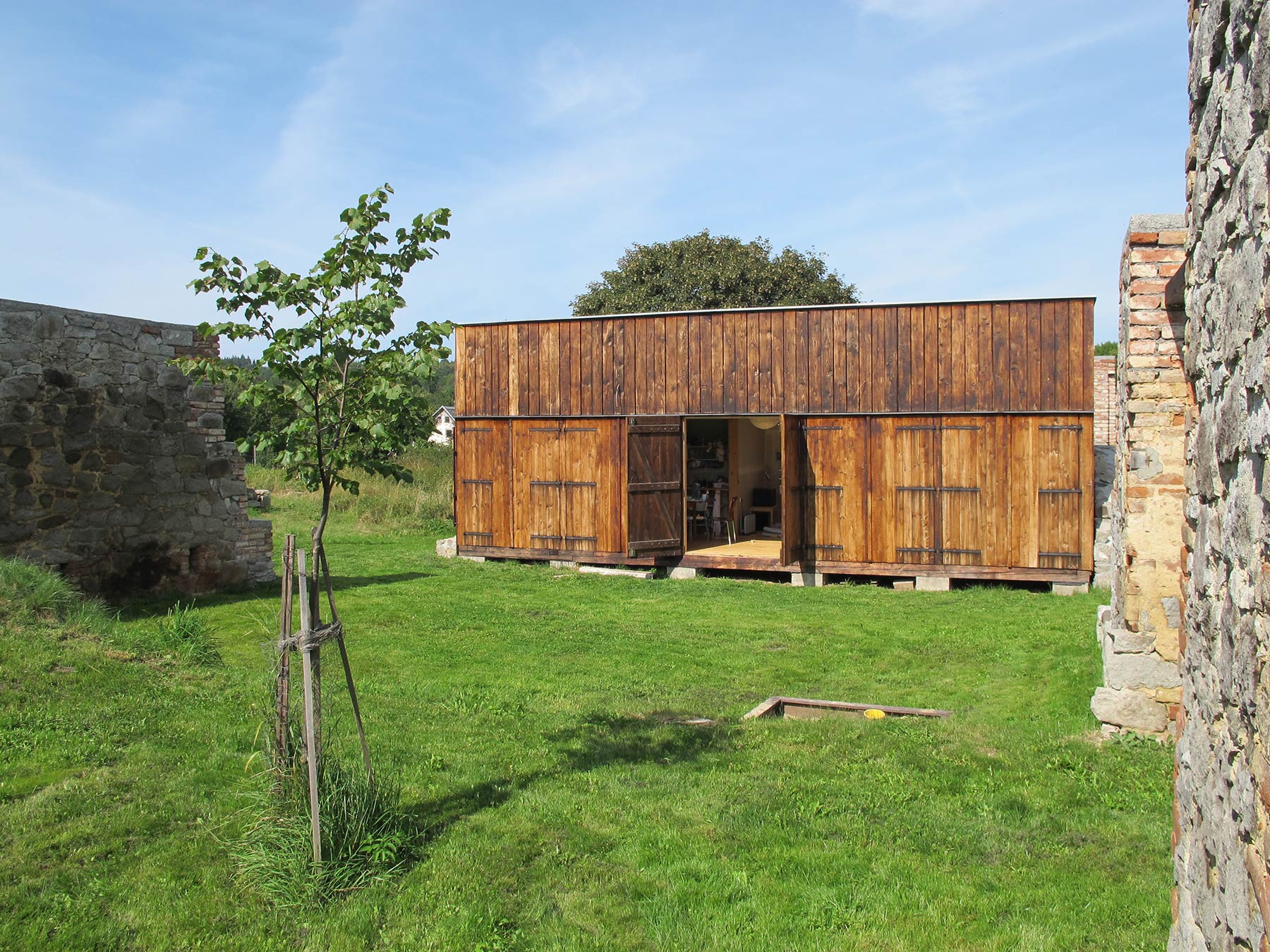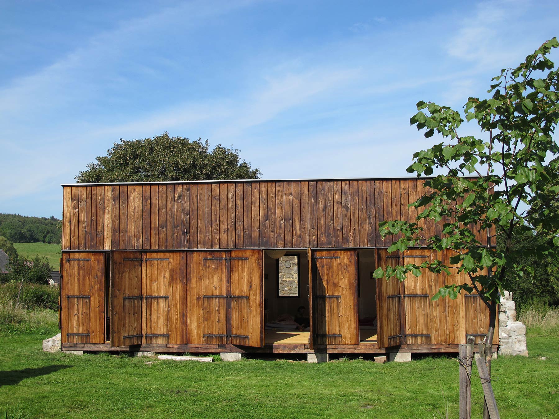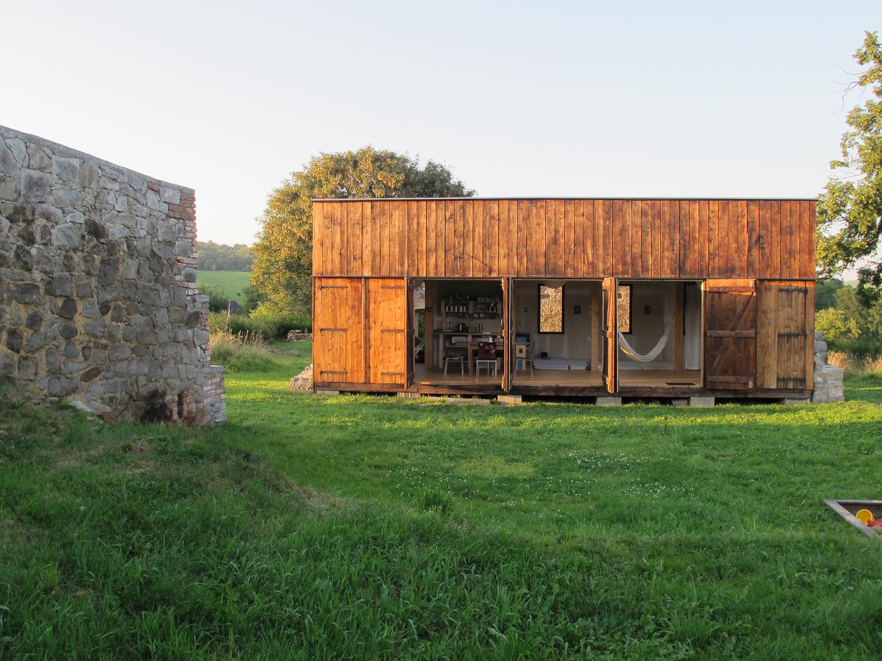 Konceptuálny projekt rekreačného celoročne obývateľného objektu našiel ideálne miesto v drsnej krajine Českého stredohoria. Netradičná drevostavba vznikla na pozemku bývalej stodoly, z ktorej ostalo len torzo obvodových stien. Ruiny autori z architektonického štúdia LABOR 13 z estetických dôvodov ponechali a novú stavbu do nich plynule integrovali.