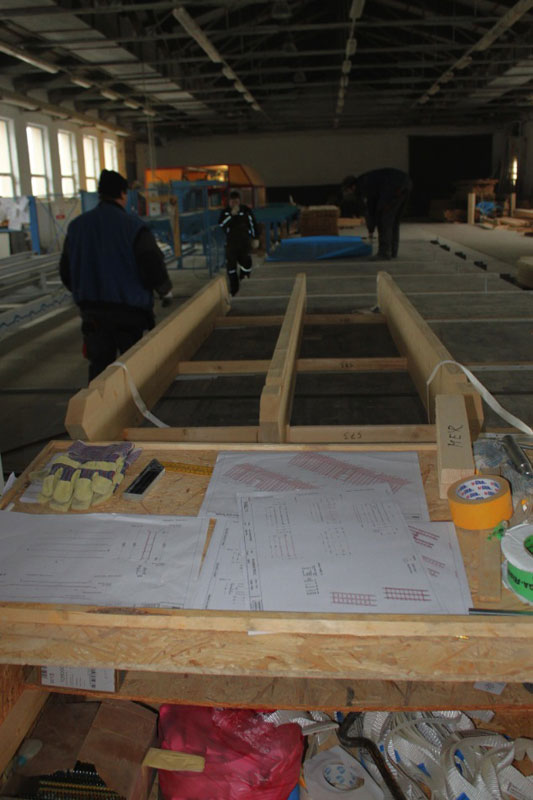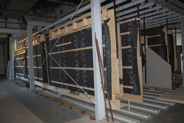 | Výroba samotného panelu. Výroba celého objektu trvala 14 pracovných dní. | Vyrobené panely pripravené na odvoz. Jednotlivé konštrukcie sú chránené protivetrovou bariérou. |