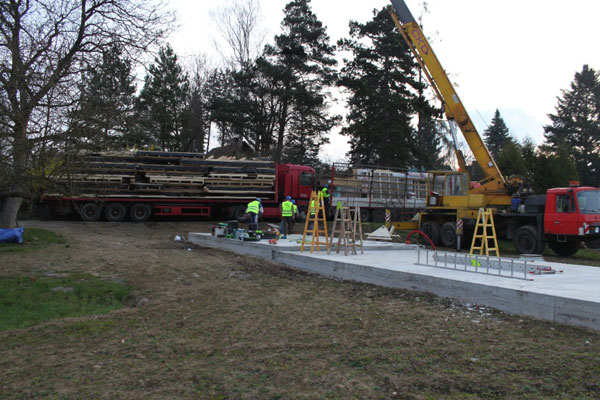 | Privezenie panelov na miesto výstavby. Samotnej montáži predchádza vyhotovenie základovej dosky s požadovanou presnosťou. | |