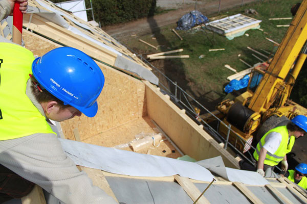 | Pohľad na dokončenú fasádu | Osadenie strešných zvodov. Na zastrešenie objektu sa použila hliníková veľkoformátová krytina. Súčasťou strešnej konštrukcie je tepelná izolácia na báze minerálnej vlny s hrúbkou 300 mm. |