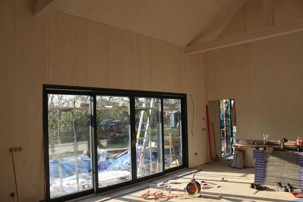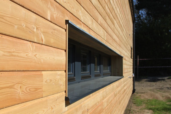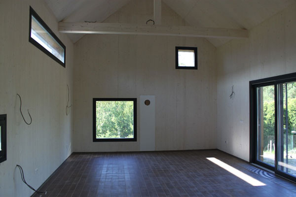 | Vyhotovenie vonkajšieho obkladu | Osadenie otvorových výplní do obvodovej konštrukcie. Interiér pôsobí aj bez zariadenia príjemným teplým dojmom. Ako alternatívu masívnej dosky ponúka výrobca obklad vnútornej steny zo sadrokartónu. |