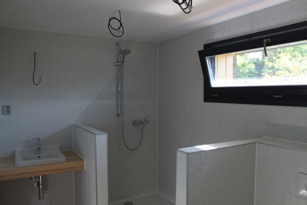 | Dokončená kúpeľňa | Pohľad do interiéru a dokončených elektroinštalácií. Všetko je pripravené na napojenie svietidiel a ostatných elektrospotrebičov. |