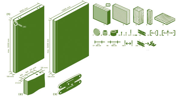 1 – ekopanel, 2 – nanesená PUR pena, 3 – stena, strop alebo podlaha, 4 – hranol zvislej, šikmej alebo vodorovnej konštrukcie, 5 – lata, 6 – doska s hrúbkou 2,5 cm, 7 – pílový kotúč, 8 – vykružovací vrták, 9 – samolepiaca páska, 10 – rozperka na skrutku do dreva 4 × 50 mm, 11 – skrutka do dreva 4 × 50 mm, 12 – skrutka do dreva 4 × 100 mm, 13 – nitovacia podložka 8,4 × 24 mm, 14 – stenová spona, 15 – typ a množstvo použitého spojovacieho materiálu pre daný detail, 16 – typ a množstvo použitého spojovacieho materiálu na m2, 17 – vzdialenosť rozmiestnenia spojovacieho materiálu od okraja, 18 – vzdialenosť rozmiestnenia spojovacieho materiálu, 19 – typ rozmiestňovaného spojovacieho materiálu, 20 – detail úpravy spony: sponu je vhodné najskôr ukotviť a až potom ohýbať do požadovaného tvaru.