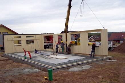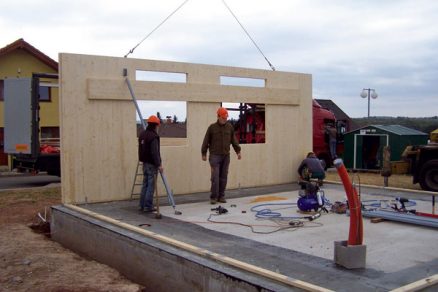 | Postupné osadzovanie jednotlivých panelov na základovú dosku a) prvá stena je osadená, |