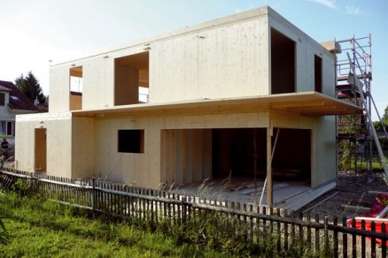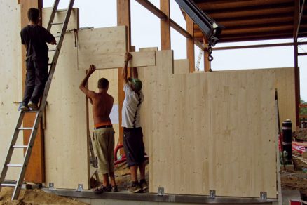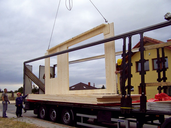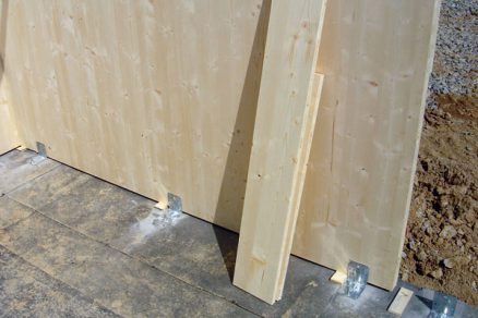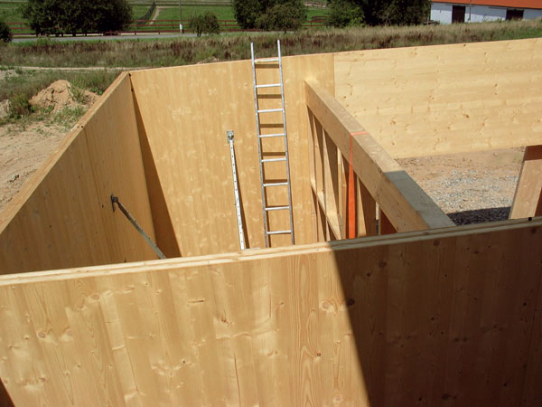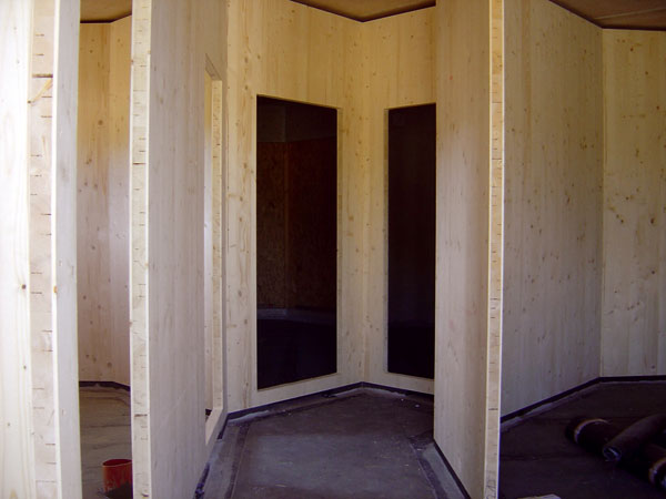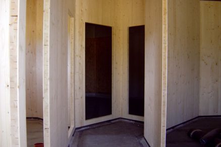 | Hotová stenová konštrukcia prízemia | Priečky v dome sú tiež z drevených panelov. |