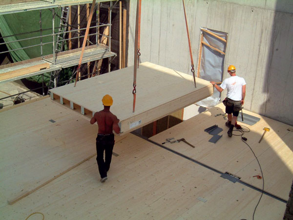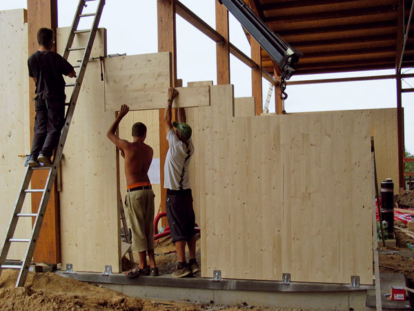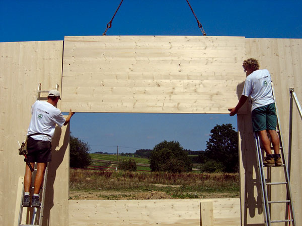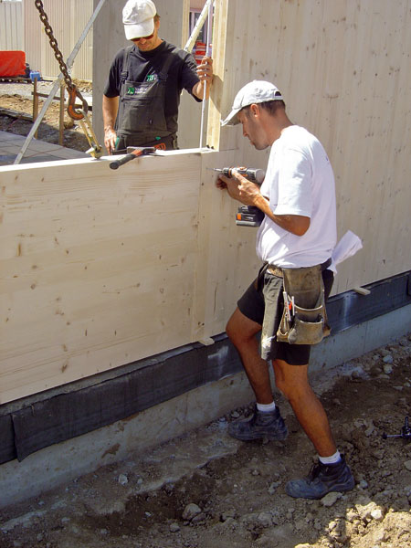 V prípade požiadaviek obojstrannej pohľadovej kvality sa spojovacie zápustky zapustia a potom sa buď použijú krytky, alebo sa opäť zatmelia a prebrúsia. Aby sa splnili požiadavky na pohľadovú kvalitu, vzduchotesnosť sa zaisťuje z vonkajšej strany (vzduchotesnými páskami na mieste spojov, prípadne vzduchotesnou fóliou na kontaktných miestach stien a stropov). Okolo okien a dverí treba na olemovanie a zakrytie škár použiť najlepšie smrekové dosky a lišty a to isté platí pre špeciálne stropné elementy. Presne pripravené komponenty z výroby sa osádzajú pomocou žeriava, montáž sa robí sťahovacími račňami. Pri dotiahnutí elementov k sebe treba vziať do úvahy pozíciu rebier.