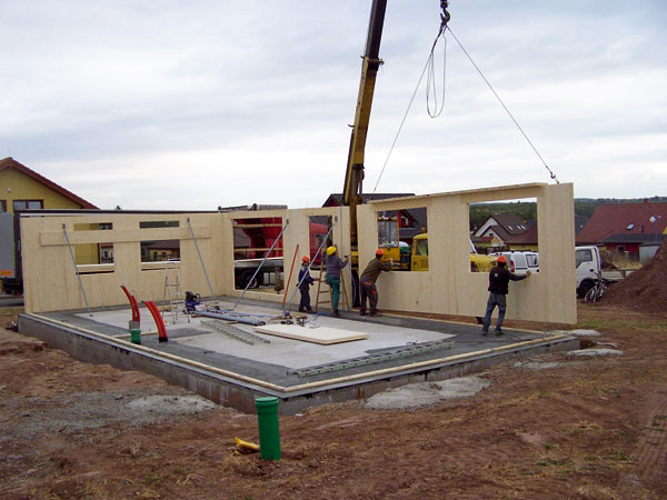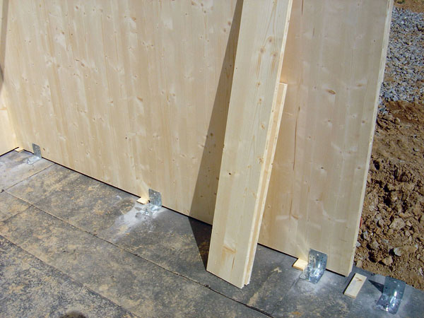 Veľmi dôležité je čo najpresnejšie rozmerať základovú dosku a pozície jednotlivých stien, aby sa montáž a napojenie jednotlivých panelov dali urobiť hladko. Panely sa môžu uložiť buď priamo na odizolovanú základovú dosku, alebo na dopredu pripravený základový trám (hranol). Ten sa najprv vymeria, osadí do vodorovnej polohy a ukotví k základovej doske (napríklad pomocou skrutiek s natĺkacou rozperkou v stredovej časti, pričom skrutka sa zapustí do hranola).