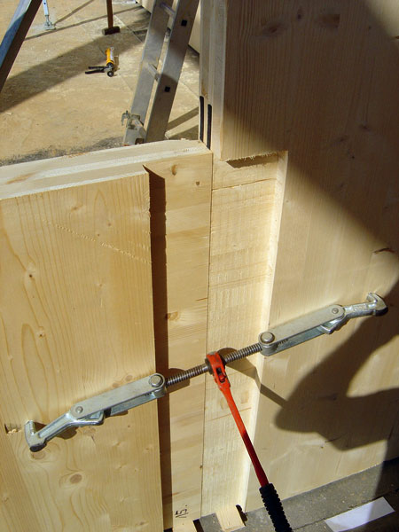 | Montovanie jednotlivých panelov k sebe pomocou stavebných zápustiek do dreva | Montáž konštrukcie pomocou sťahovacích rační |