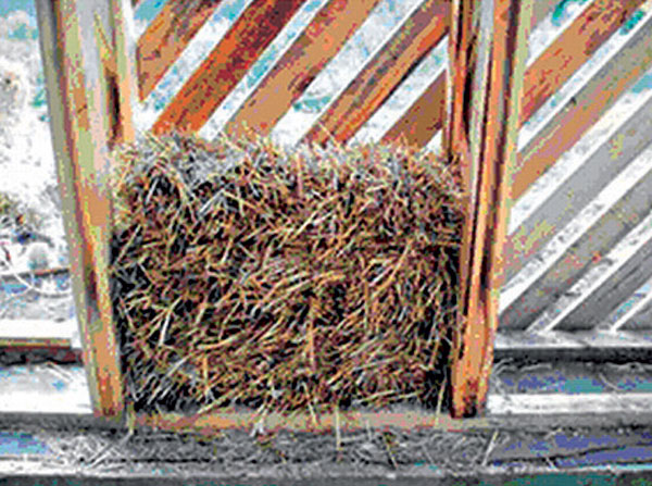 Ide o skeletovú konštrukciu tvorenú prevažne z drevených profilov, ktorá preberá zaťaženie zo strechy a prenáša ho do základov (obr. 2). Slamené baly plnia tepelnoizolačnú funkciu.