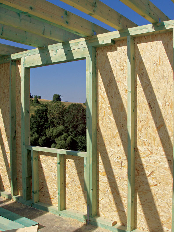Nie častým, ale perspektívnym a trendovým riešením obvodového plášťa pre NED a pasívne budovy sú celostenové bloky z lepeného lamelového dreva (obr. 3). Vrstva lepeného dreva na interiérovej strane plní hlavne nosnú funkciu. Vrstva tepelnej izolácie sa pridáva smerom do exteriéru spolu s ostatnými vrstvami konštrukcie. Takýmto usporiadaním vrstiev možno eliminovať tepelné mosty vznikajúce v miestach napojenia obvodovej steny so stropom a strešným plášťom. Vrstva lepeného dreva má aj lepšie akumulačné vlastnosti, ktoré priaznivejšie vplývajú na kolísanie vnútornej klímy. V neposlednom rade netreba zabudnúť na estetickú hodnotu lepeného dreva, pri ktorom možno eliminovať jeho viditeľné chyby, ako sú hrče, praskliny a podobne.