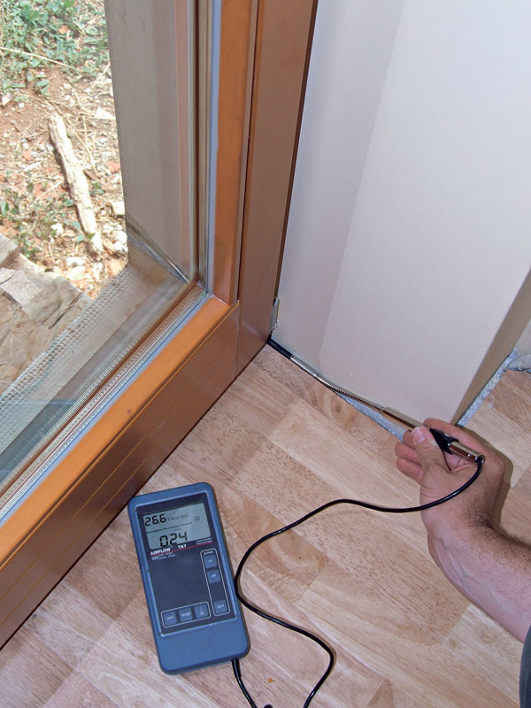 Počas zimnej sezóny 2008/2009 objekt nebol obývaný (objekt bol skolaudovaný na jeseň 2008), čo umožnilo realizovať jeho monitorovanie bez prevádzky a vykurovania (počas tohto obdobia prebehli merania parametrov klímy, ako aj spotreby energie počas mesačného vykurovacieho cyklu, v ktorom sa termostaticky udržiavala teplota na +20 °C). Prepočítaná merná spotreba tepla neobývaného objektu na vykurovanie počas vykurovacej sezóny bola 7,8 kWh/(m2 . rok). Realizovalo sa aj prvé meranie Blower-door testom (obr. 7, 8), ktoré preukázalo aj s ohľadom na indikované a odstrániteľné chyby vysokú vzduchotesnosť (1,2/h) s reálnou možnosťou dostať sa pod hodnotu 0,6/h čo predstavuje hranicu pre energeticky pasívny dom.