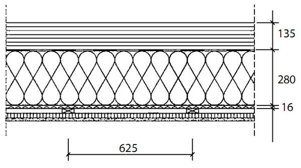 Strešný plášť, ktorý tvoril strop podkrovia pod nevykurovaným priestorom (obr. 6), bol z dreveného roštu, vyplneného izoláciou Isover Unirol Profi s hrúbkou 280 mm a prídavnej izolačnej vrstvy zo sklenej vlny umiestnenej z vnútornej strany s hrúbkou 60 mm. Na montovanej časti plášťa sa realizovala účinná parozábrana s dôsledne prelepenými stykmi a utesnenými detailmi v mieste ostení (systém pások 3D), v mieste prechodov a napojenia na podlahu. Na izolovanie podlahy na teréne sa použil penový polystyrén Isover EPS roof 150 s hrúbkou 200 mm a s hodnotou súčiniteľa tepelnej vodivosti λD = 0,034 W/(m . K) – vo výpočte sa zohľadnilo dvojrozmerné šírenie tepla v podzákladí.