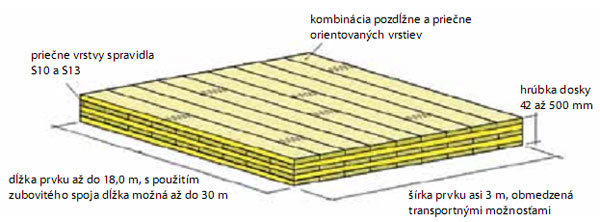 Na dosiahnutie požadovaných pevnostných a požiarnych vlastností CLT-elementov sa používajú rôzne konfigurácie pozdĺžnych a priečnych vrstiev. Troj- alebo päťvrstvové elementy (obr. 10) majú hrúbku približne 100 mm (170 mm). Na stavbu mostov sa používajú hrubšie elementy.