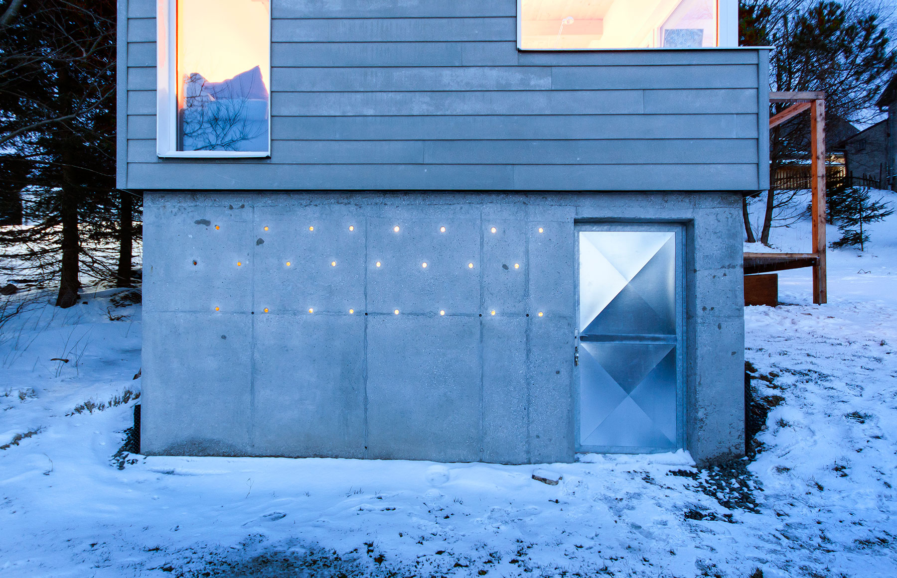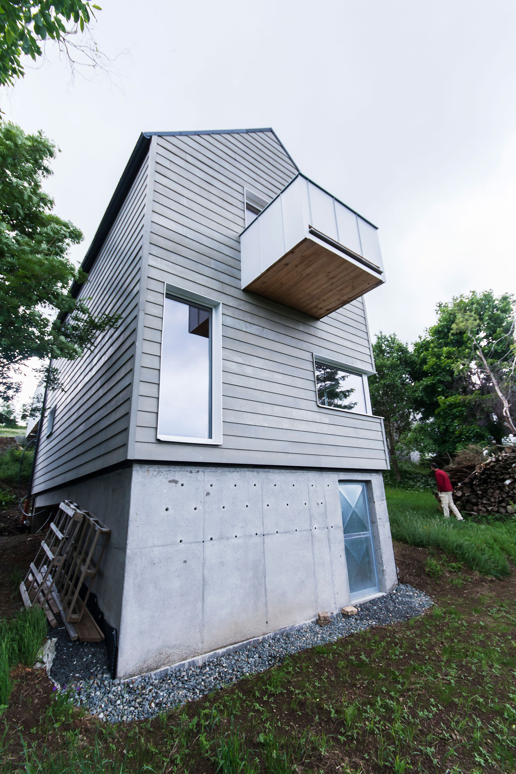 Chata je materiálovo riešená ako drevostavba stojaca na sokli z pohľadového betónu. Nezvyčajne je riešený aj prestup svetla do betónovej pivnice – prostredníctvom do betónu zaliatych sklených tyčí. Elegantná i praktická fasáda domu je riešená obkladom z na pásy narezaných cementotrieskových Cetris dosiek.