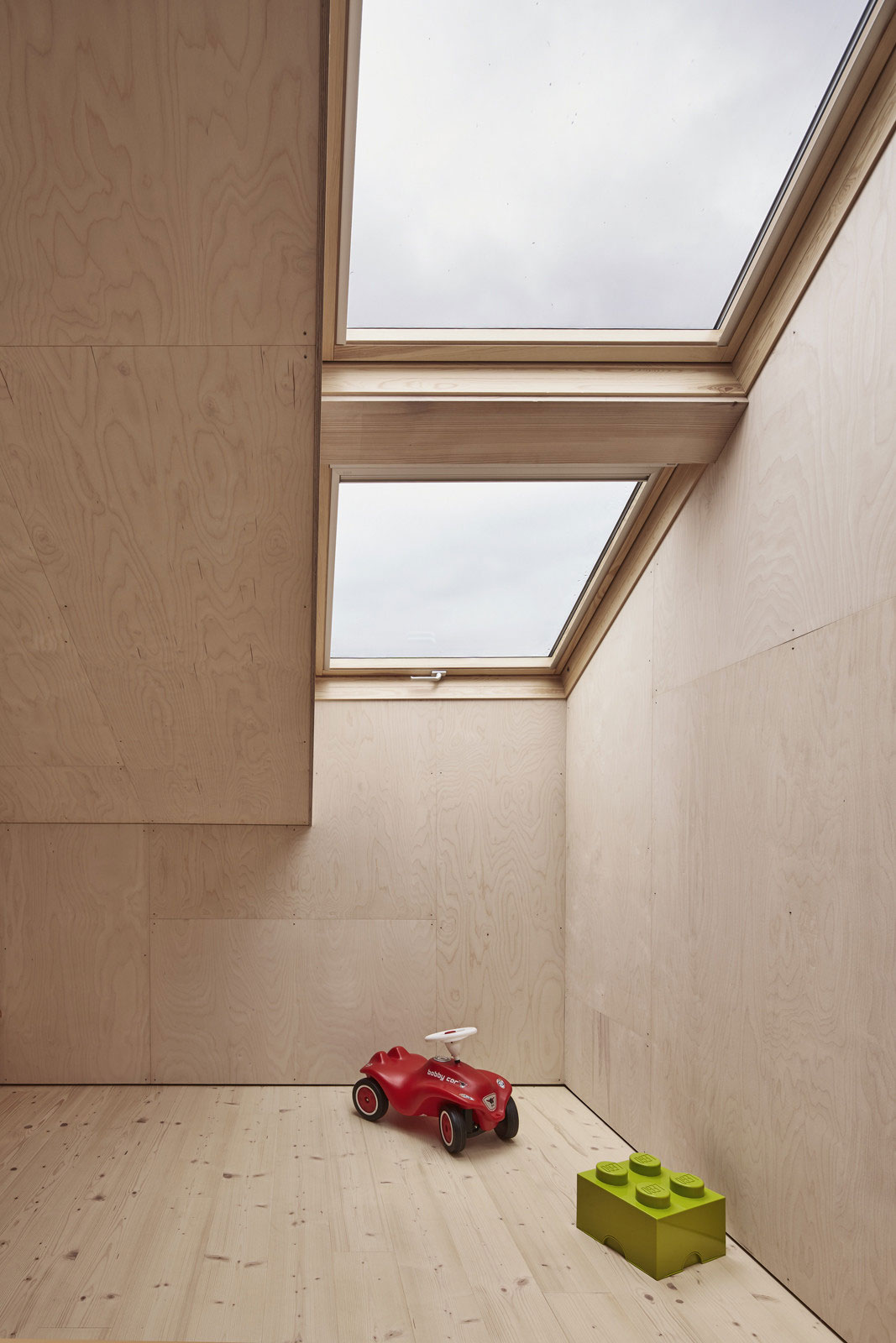 Poschodový dom je obložený smrekovým obkladom, ktorý časom bude naberať zaujímavú patinu. Smrekové drevo vládne aj v interiéri, kde sa uplatňuje v podobe podlahovej krytiny, rámov veľkoformátových okien, nábytku vyrobeného na mieru či v podobe schodov, stropných a stenových obkladových panelov. Smrek teda zohráva v tomto dome najvýznamnejšiu rolu, nachádza sa totiž skutočne v každej miestnosti.