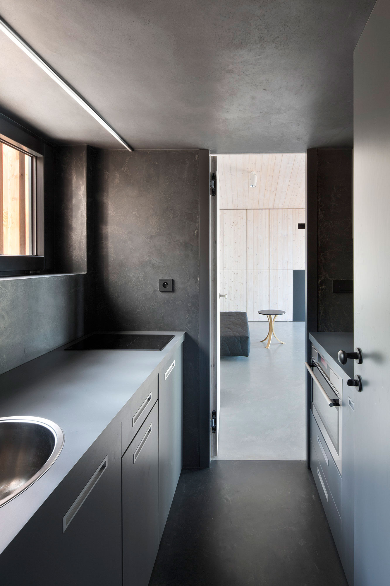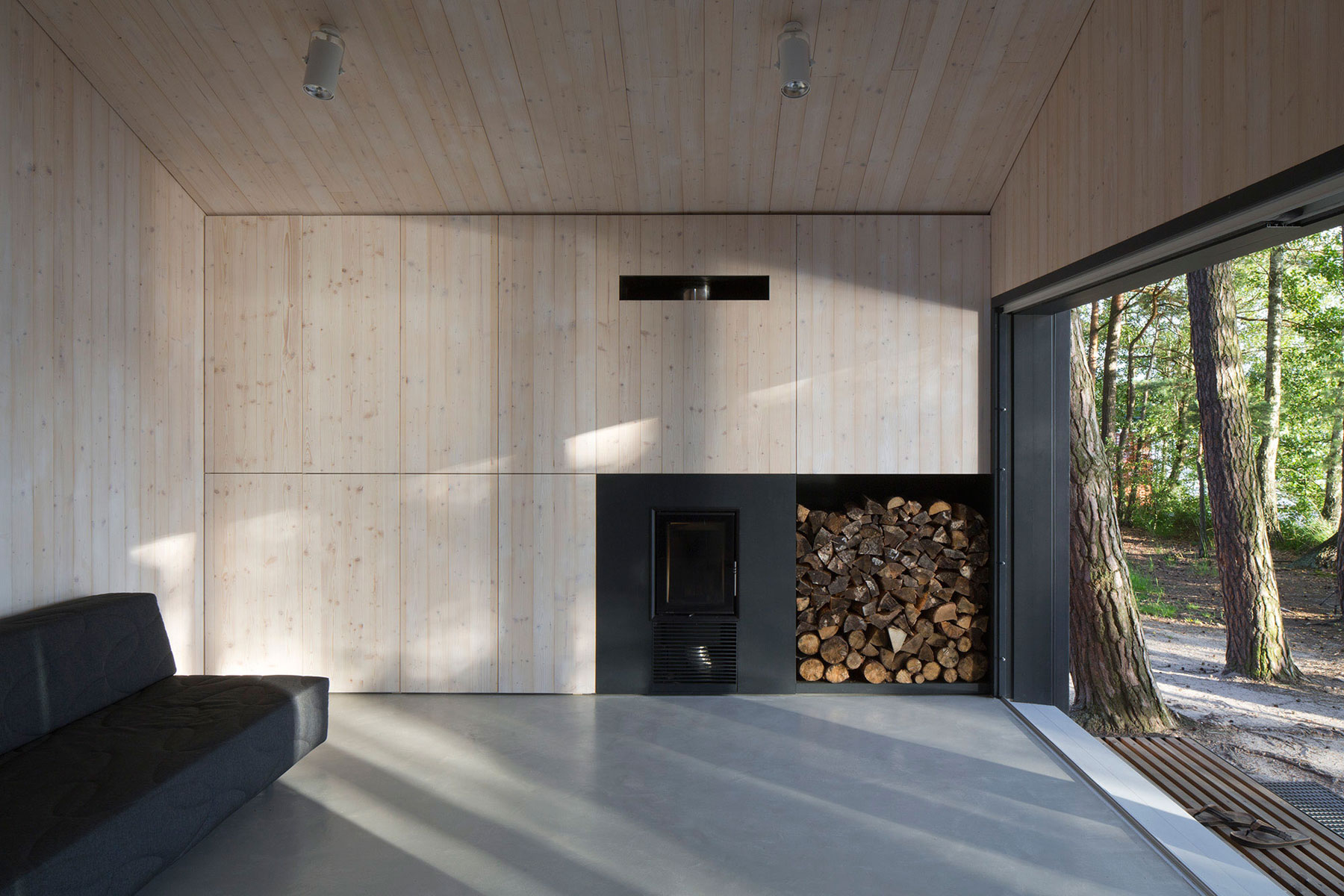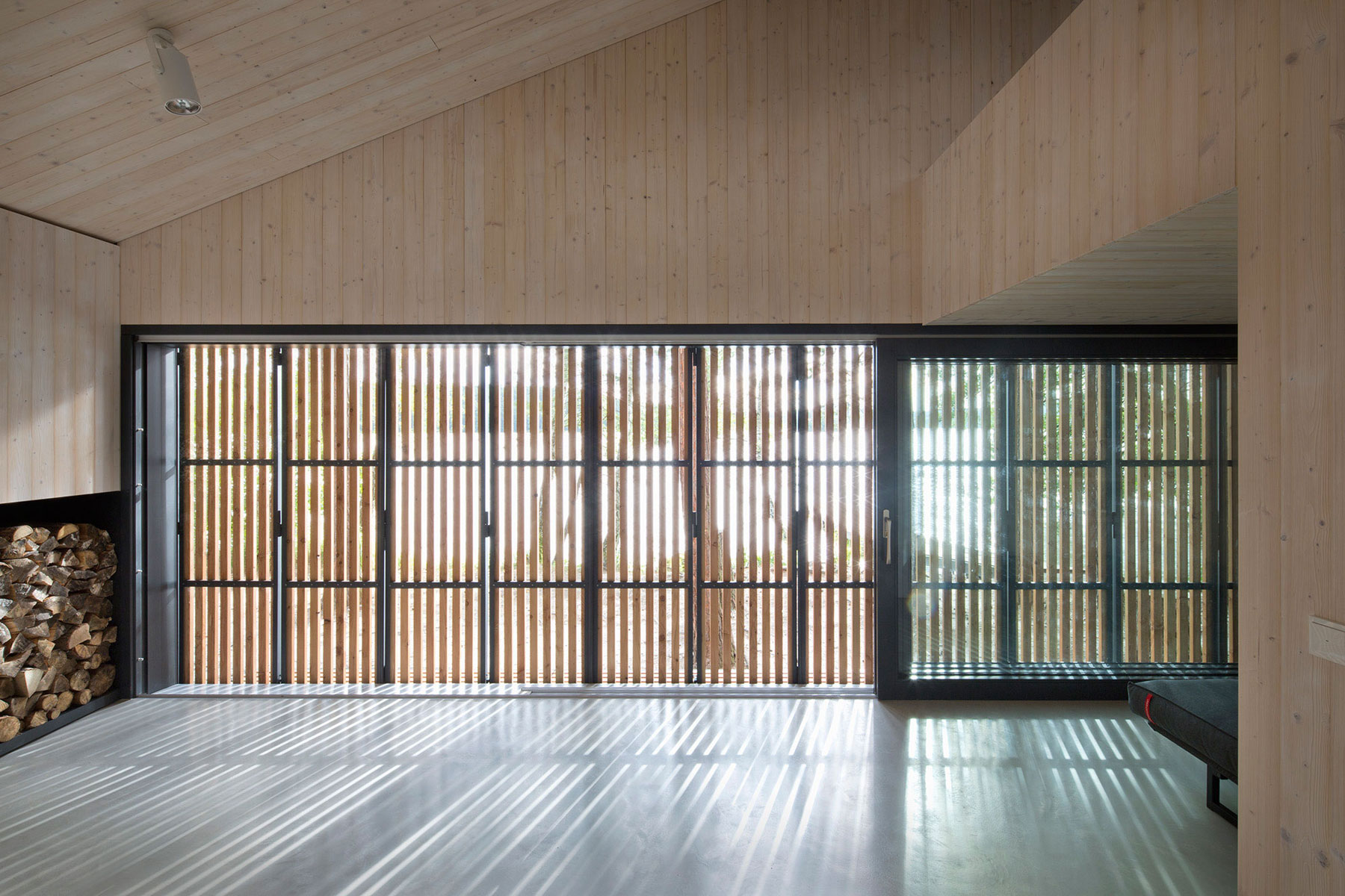 Do priestoru je vstavaná galéria na spanie, pod ktorou je v čiernom boxe umiestnené kompaktné hygienické a kuchynské zázemie. Hlavnú stenu v interiéri tvorí hlboká skriňa s najväčšími úložnými kapacitami, do ktorej je vstavaná kozubová vložka. Celý interiér je materiálovo zjednotený obkladom z kefovaných drevených paluboviek natretých bielym olejom.