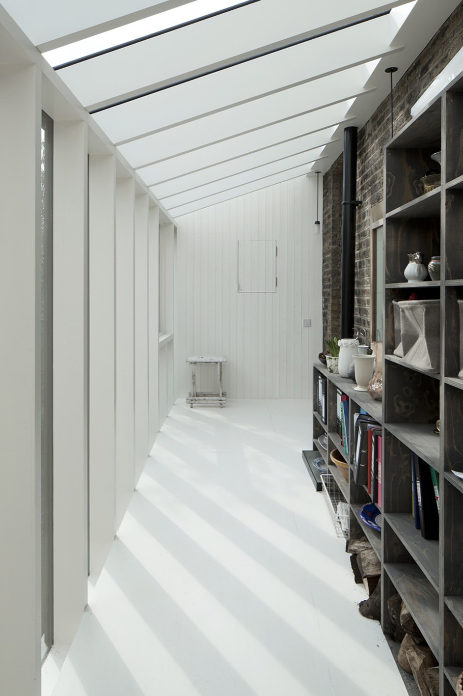 Chodba pozvoľne klesá od rodinného domu k spálni a kúpeľni na konci prístavby. Úzky priestor komunikácie bol opticky zväčšený bielym svetlým povrchom. Prechod týmto homogénnym priestorom spestrujú výhľady na zeleň za oknami.