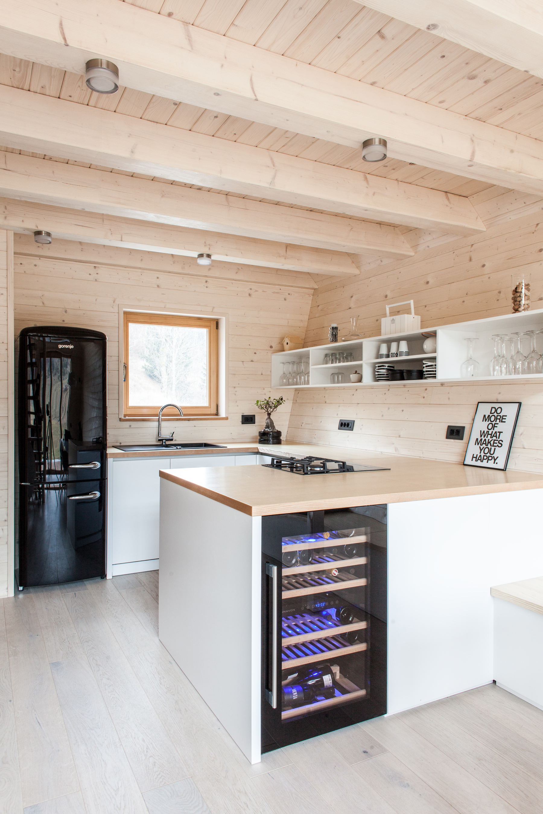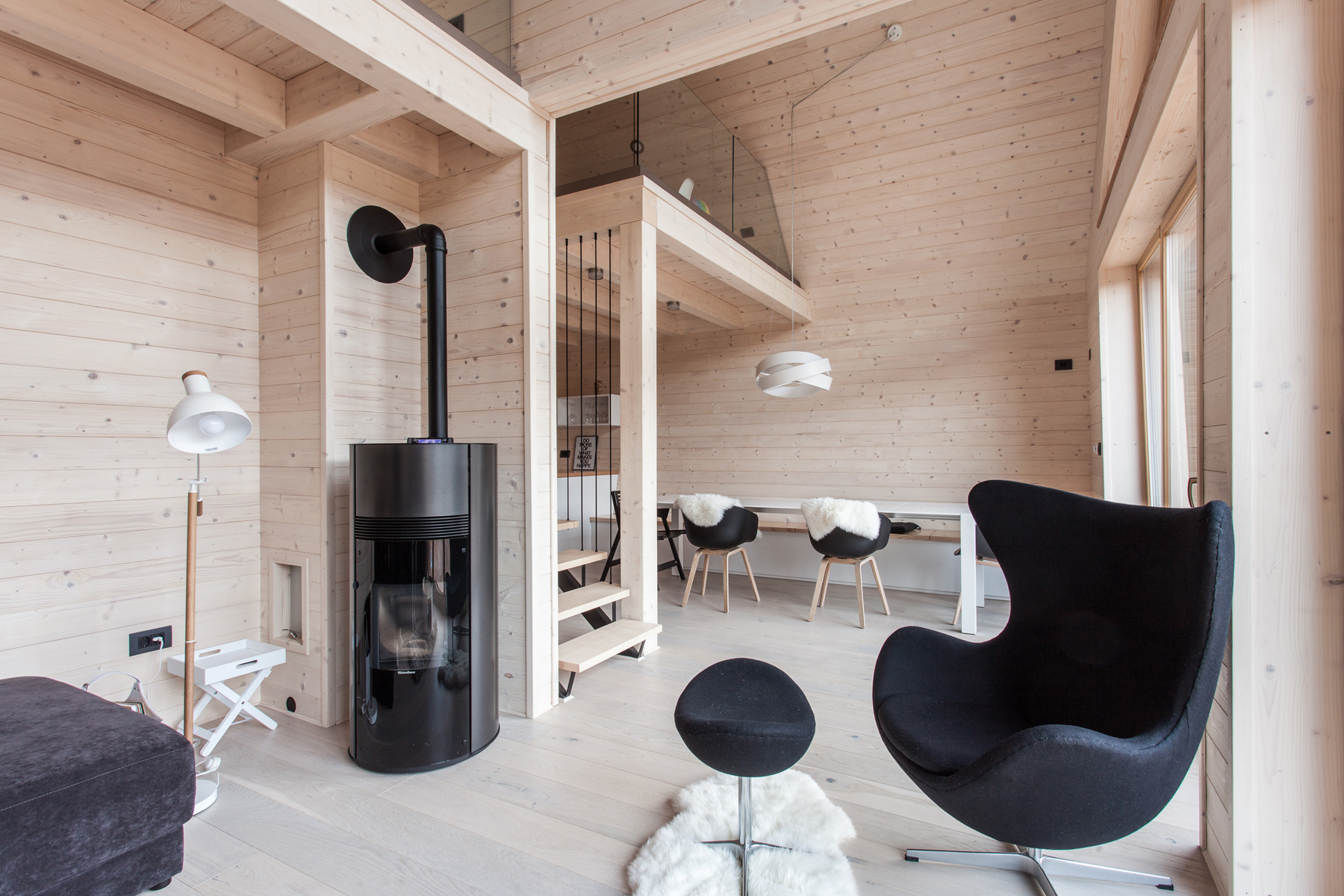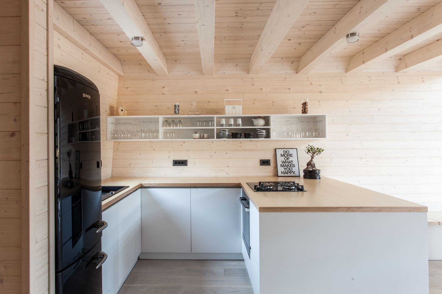Je riešený sviežo, v jasnej farebnej kombinácii svetlého dreva a bielej s kontrastom čiernych doplnkov. Na prízemí sa nachádza kuchyňa, obývacia miestnosť a kúpeľňa so saunou.