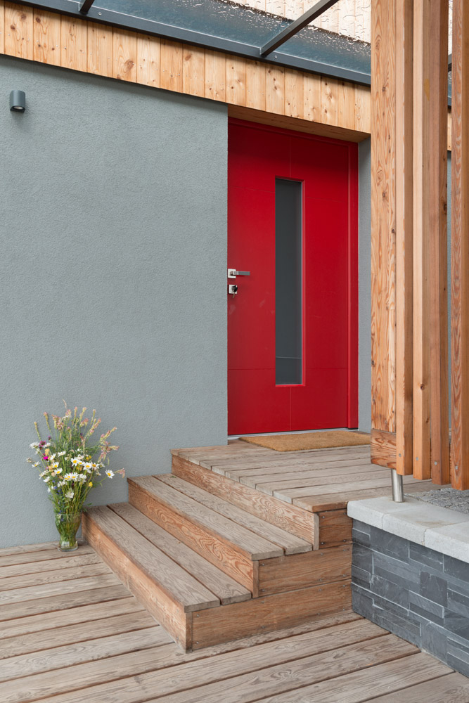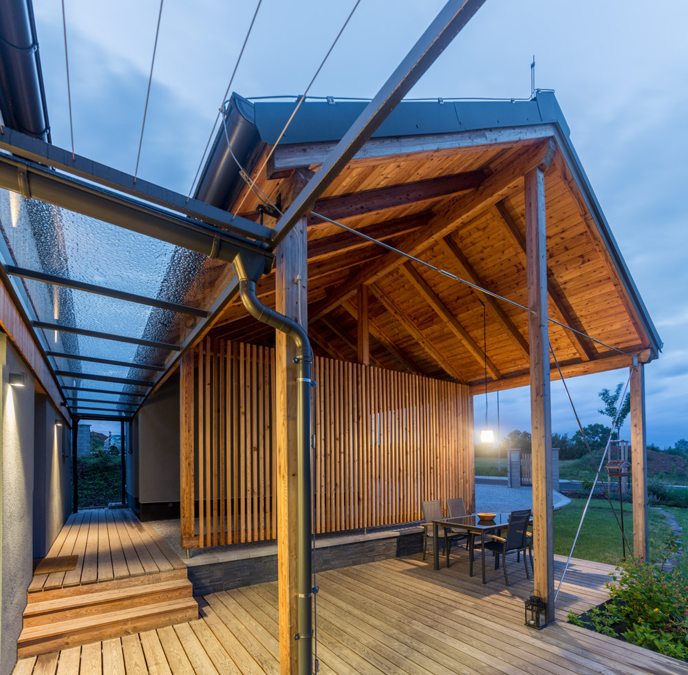 Tienenie okien zaistia vonkajšie textilné rolety s priznanými vodiacimi lankami a skrytými hrantíkmi. Jednoduchý vzhľad domu je ozvláštnený kombináciou dreva a kovu na fasáde, oknách a na klampiarskych prvkoch, ku ktorým je vhodným kontrastom všadeprítomná zeleň. Popínavé rastliny na východnej a južnej strane krytého priestoru na sedenie príjemne utlmia letné slnko a súčasne chránia terasu pred kontaktom s verejnými komunikáciami.
