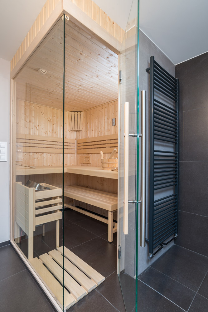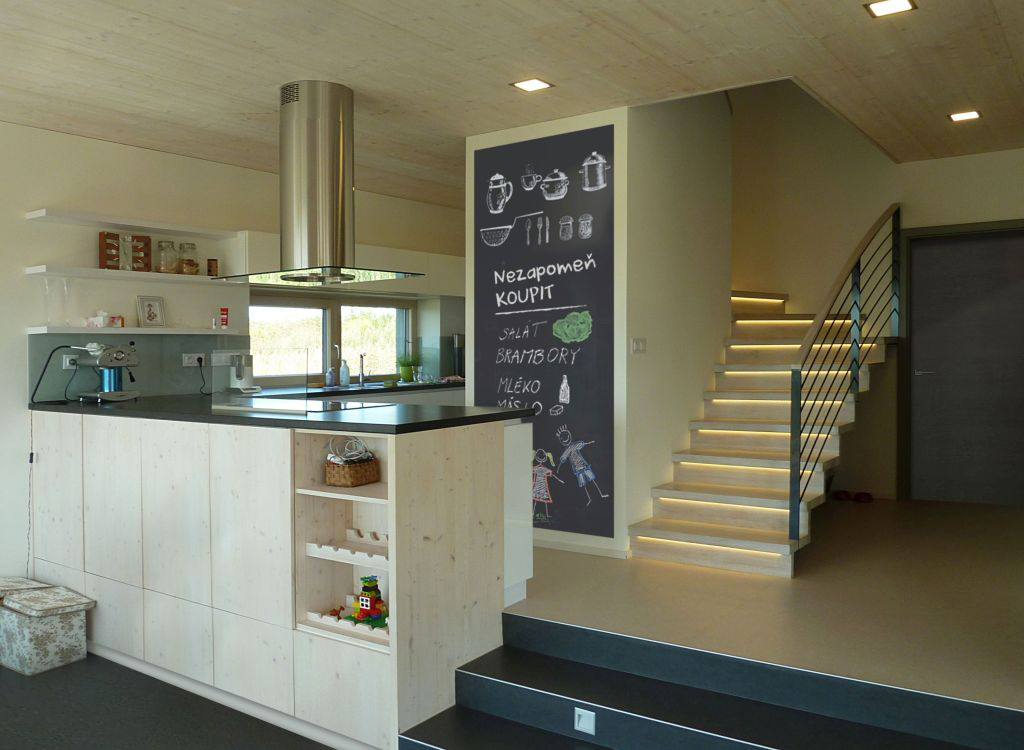 V nadväznosti na kuchyňu je časť schodiskovej steny riešená ako tabuľa na odkazy a ďalší diel má betónovú stierku. Drevo schodiska svojím odtieňom zodpovedá vzhľadu stropu. Základná farebnosť vybavenia kladie dôraz na chladnú a nadčasovú kombináciu čiernej a bielej, na prvky z nehrdzavejúcej ocele a na doplnky v sýtych odtieňoch.