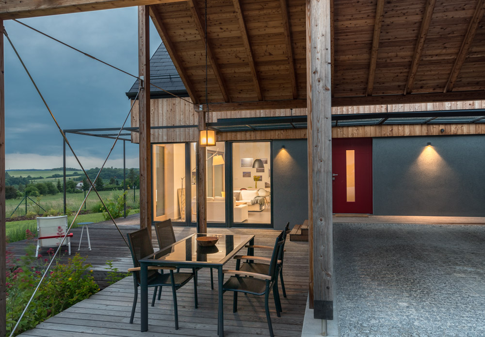 Hrebeň strechy je orientovaný na osi sever – juh a vstup do domu sa nachádza z východnej strany. Z rovnakej strany sa nachádza aj prístavba garáže a kryté parkovacie státie so sedlovou strechou. Oba objekty sú prepojené ľahkou konštrukciou, čiastočne krytou sklom proti dažďu. Táto konštrukcia postupne prechádza k subtílnej pergole, podpornej konštrukcii na popínanie rastlín, ktorá počas letných mesiacov chráni interiér domu pred prehriatím.
