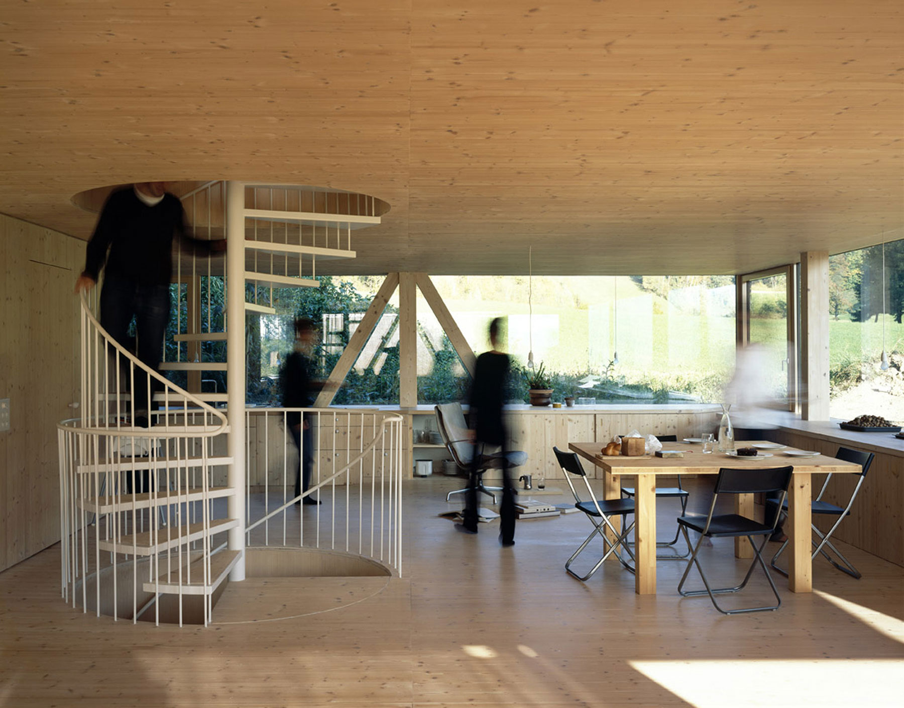 Dom Stöckli je síce čiastočne podpivničený, väčšia časť však stojí na betónovej základovej doske, zapustenej pod úroveň terénu. Hĺbka zapustenia nie je náhodná – architekt ju stanovil presne tak, aby bola kuchynská pracovná doska spolu so zabudovaným nábytkom pozdĺž okien v jednej rovine so záhradou. „Miestnosť sa takto stáva jednotným priestorom, navyše – vďaka optickej komunikácii s okolím – veľmi veľkorysým,“ dodáva architekt.
