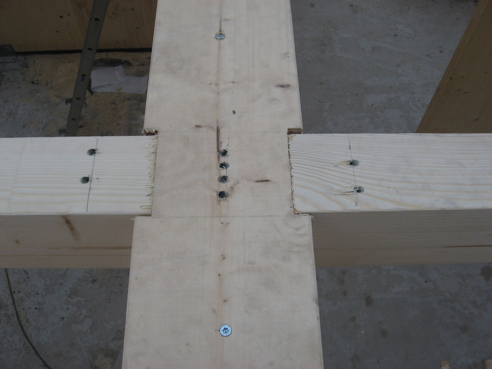 Panely sú spájané drevoskrutkami s čiastočným a celým závitom. Vzájomná vzdialenosť skrutiek bola stanovená statickým výpočtom. Montáž jedného podlažia trvala asi 5 hodín, pričom na montáž stačil jeden žeriav a traja pracovníci. Na panely orientované v priečnom smere domu boli uložené trámy, ktoré vzájomne prepájajú panely na protiľahlých stranách. Trámy plnia funkciu stužujúceho venca (ďalej vencové nosníky).