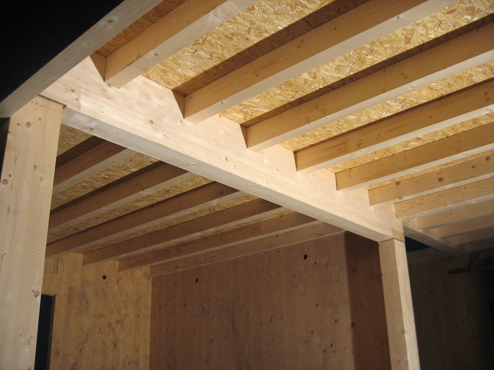 Stropná konštrukcia pozostáva z trámov z reziva KVH, ktoré sa ukladali do vyrezaných káps v paneloch a do vyfrézovaných drážok lepeného lamelového prievlaku. Vzhľadom na vysokú prácnosť prípojov nosníkov a prievlaku trvala montáž stropnej konštrukcie „až“ necelé dva dni. Stropné nosníky budú spriahnuté s betónovou doskou s hrúbkou 80mm. Spriahnutie drevených trámov s betónovou doskou zvyšuje tuhosť stropnej konštrukcie vo vertikálnom aj horizontálnom smere. Výhody takejto konštrukcie sú aj v oblasti stavebnej fyziky. Minimalizuje sa kmitanie stropnej konštrukcie, zlepšujú sa akustické vlastnosti, zvyšuje sa požiarna odolnosť stropu, navyše betón slúži aj ako tepelno-akumulačná vrstva.