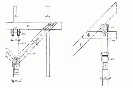 | Spájanie krokiev vo vrchole – kombinácia preplátovanie + klincovanie | Spájanie krokiev s klieštinami – klincovaný spoj so svorníkom |