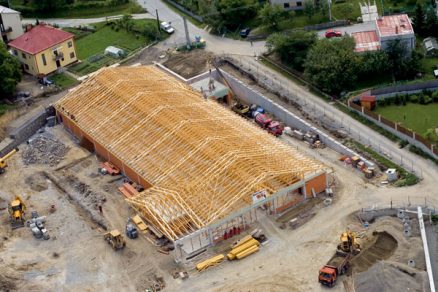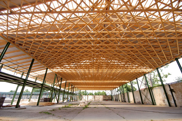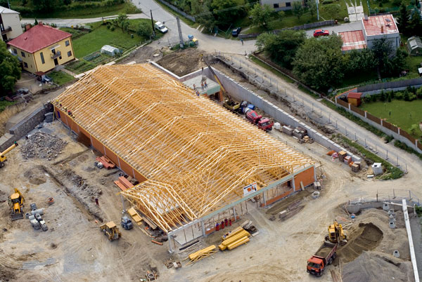 Stavebne veľmi jednoduchý objekt obdĺžnikového tvaru využíva schopnosť priestorovej drevenej konštrukcie zhotovenej z priehradových väzníkov so styčníkovými doskami prestropiť rozmery väčšie ako 20,0 m. Na murovanej konštrukcii stuženej železobetónovými stĺpmi a vencom sú uložené jednotlivé väzníky, ktoré vytvárajú valbovú strechu. Podobných objektov sa v uplynulých rokoch postavilo niekoľko desiatok. Práve na tomto príklade možno demonštrovať skutočnosť, že jednotlivé väzníky pôsobiace v rovine a navrhnuté bezpečným softvérom sú spoľahlivé, pokiaľ je zabezpečená ich rovinnosť. Ak väzník vybočí z roviny, geometrickým radom klesá jeho únosnosť, čo môže viesť k poruchám, až k prípadnému kolapsu konštrukcie.