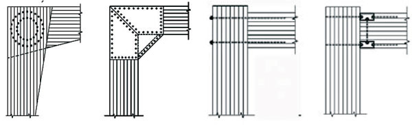 Ich prúty možno spájať aj po dĺžke, čo umožňuje viac konštrukčných riešení ako pri použití rasteného reziva. Možnosti usporiadania rámových rohov sú znázornené na obr. 1.