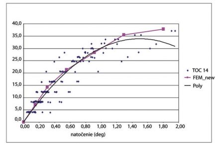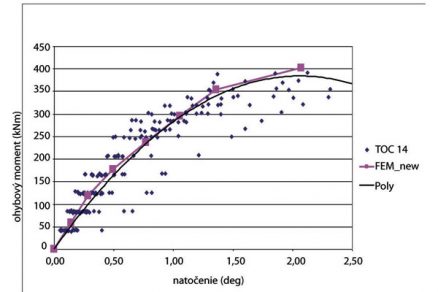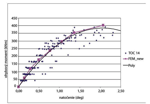Na obr. 4 a 5 sú zobrazené hľadané výsledné krivky M-ϕ (tenká čierna čiara), ich vyhodnotenie a porovnanie s krivkou M-ϕ získanou z riešení pomocou konečných prvkov (čiara so štvorcovým symbolom). Rozdiely medzi výslednou experimentálnou krivkou a krivkou z vypočítaného modelu sú rádovo do 3 % v oblasti, ktorá je podstatná pre navrhovanie styčníka a jeho pôsobenie. Nesúlad krivky na základe experimentu a krivky z výpočtu MKP je v poslednej fáze kolapsu styčníka, keď sa prejavuje nedostatočne výstižné modelovanie nelineárneho správania dreva.